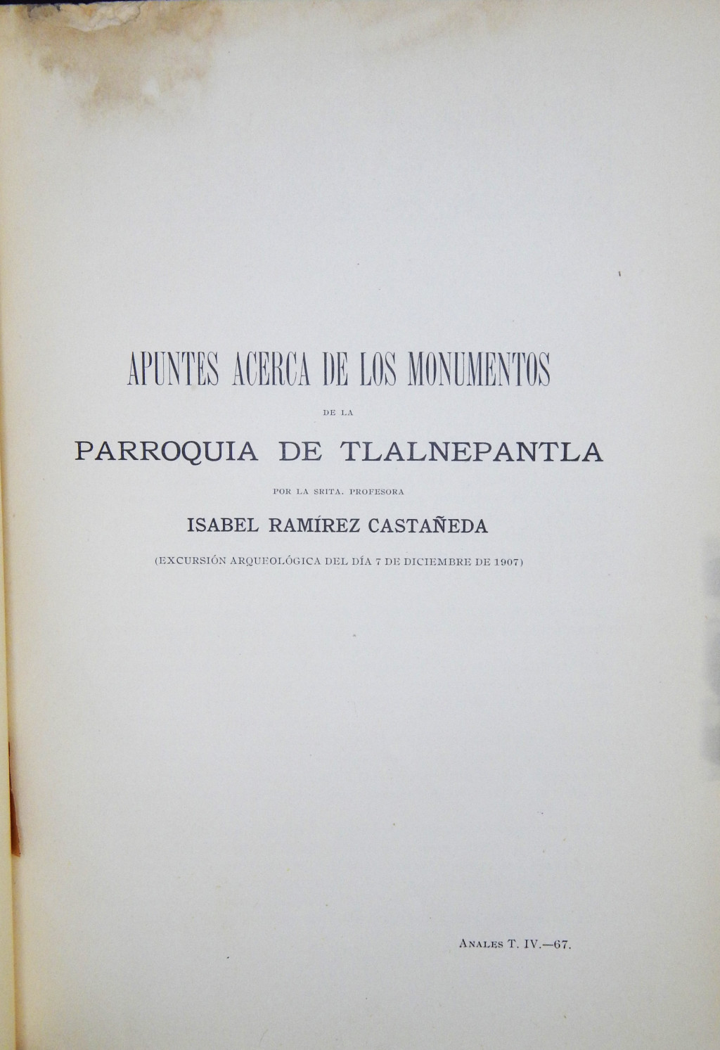 Particularidades: Los datos de la obra fueron tomados de otras fuentes y no de la portada. A la cabeza de la p. [533] grabado con cenefa. Láminas, jeroglíficos y fotografías a lo largo de la obra. Al final de la p. 543, "México, 6 de enero de 1908." En el ángulo inf. der., de la falsa portada tiene impreso: ANALES T. IV. -67.