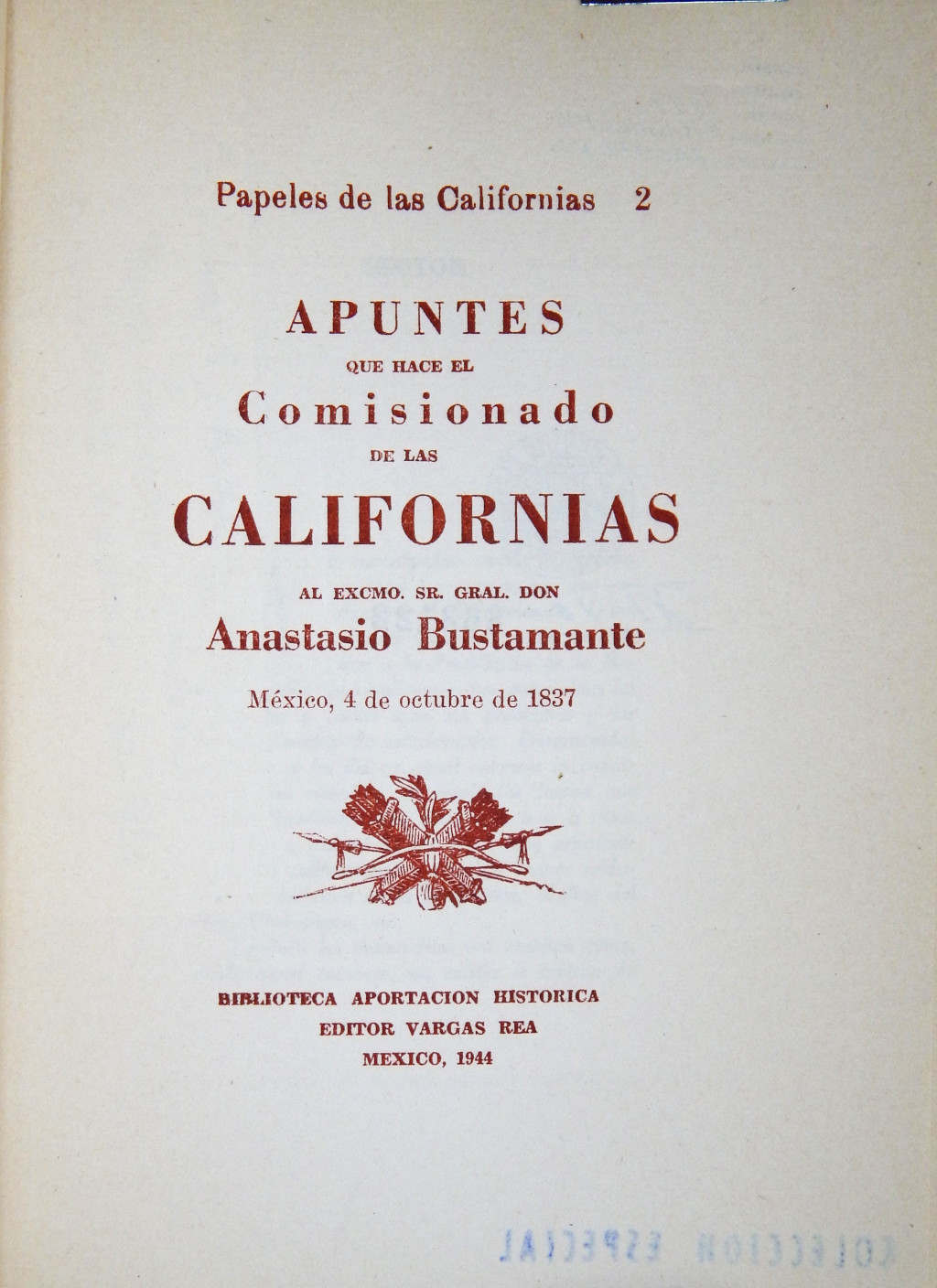 Apuntes que hace el comisionado de las Californias al Excmo. Sr. Gral. Don Anastasio Bustamante, México 4 de octubre de 1837 MX-SC-DGB-BM-RV-22248 Descargar Registro catalográfico Orden25592No. de registro22248Clave de obraMX-SC-DGB-BM-RV-22248No. de clasificación979.4No. de autorC35Autor personalCastillero S., AndrésTítuloApuntes que hace el comisionado de las Californias al Excmo. Sr. Gral. Don Anastasio Bustamante, México 4 de octubre de 1837Mención de autoríaAndrés Castillero S.Ciudad, paísMéxicoLugar asociadoMéxicoEditorialVargas ReaAño de publicación1944Siglo de publicaciónSiglo XXDescripción física37 p.SeriePapeles de las CaliforniasNúmero de serie2Materias generalesBaja California -- Historia | Bustamante, Anastasio, 1780-1853ColecciónColección Roberto Valles