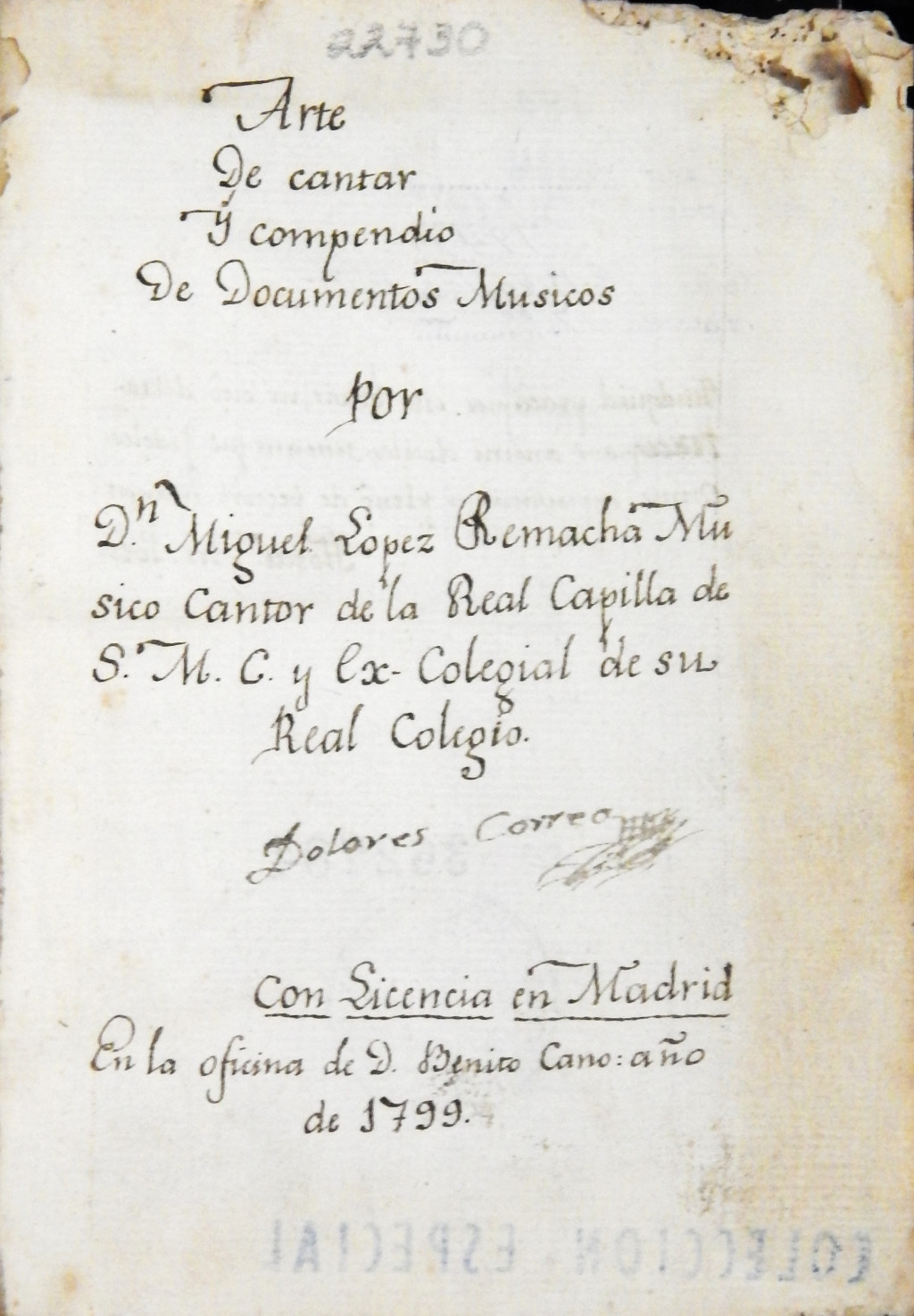 Arte de cantar y compendio de documentos músicos MX-SC-DGB-BM-RV-22730 Descargar Registro catalográfico Orden26246No. de registro22730Clave de obraMX-SC-DGB-BM-RV-22730No. de clasificación784No. de autorL66Autor personalLópez Remacha, Miguel, 1772-1827TítuloArte de cantar y compendio de documentos músicosMención de autoríapor Dn. Miguel Lopez RemachaCiudad, paísMadridLugar asociadoEspaña > MadridEditorialOfna. de Benito CanoAño de publicación1799Siglo de publicaciónSiglo XVIIIDescripción física96 p.Materias generalesTexto en letra manuscritaColecciónColección Roberto Valles Área de notas Nota de contenidoTexto en manuscrito