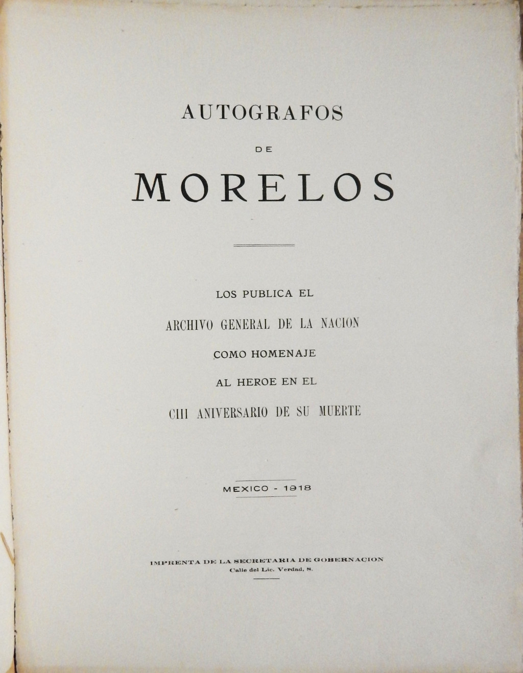 Autógrafos de Morelos MX-SC-DGB-BM-JGI-39985 Descargar Registro catalográfico Orden50135No. de registro39985Clave de obraMX-SC-DGB-BM-JGI-39985No. de clasificación092No. de autorM67Segundo no. de autorA87Autor personalMorelos y Pavón, José María, 1765-1815TítuloAutógrafos de MorelosCiudad, paísMéxicoLugar asociadoMéxicoEditorialImpr. de la Secretaría de GobernaciónAño de publicación1918Siglo de publicaciónSiglo XXDescripción física1 Portafolio (46 Hojas de láminas) ; 34 cm.Materias generalesMorelos y Pavón, José María, 1765-1815 -- Autógrafos | Autógrafos -- México -- FacsímilesColecciónColección Joaquín García Icazbalceta Área de notas Notas generalesLos publica el Archivo General de la Nación como homenaje al héroe en el CIII aniversario de su muerte