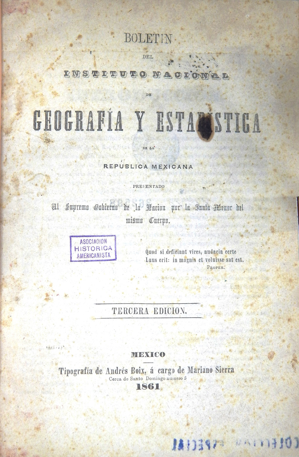 Boletín del Instituto Nacional de Geografía y Estadística de la República Mexicana presentado al Supremo Gobierno de la Nación por la Junta Menor del mismo Cuerpo