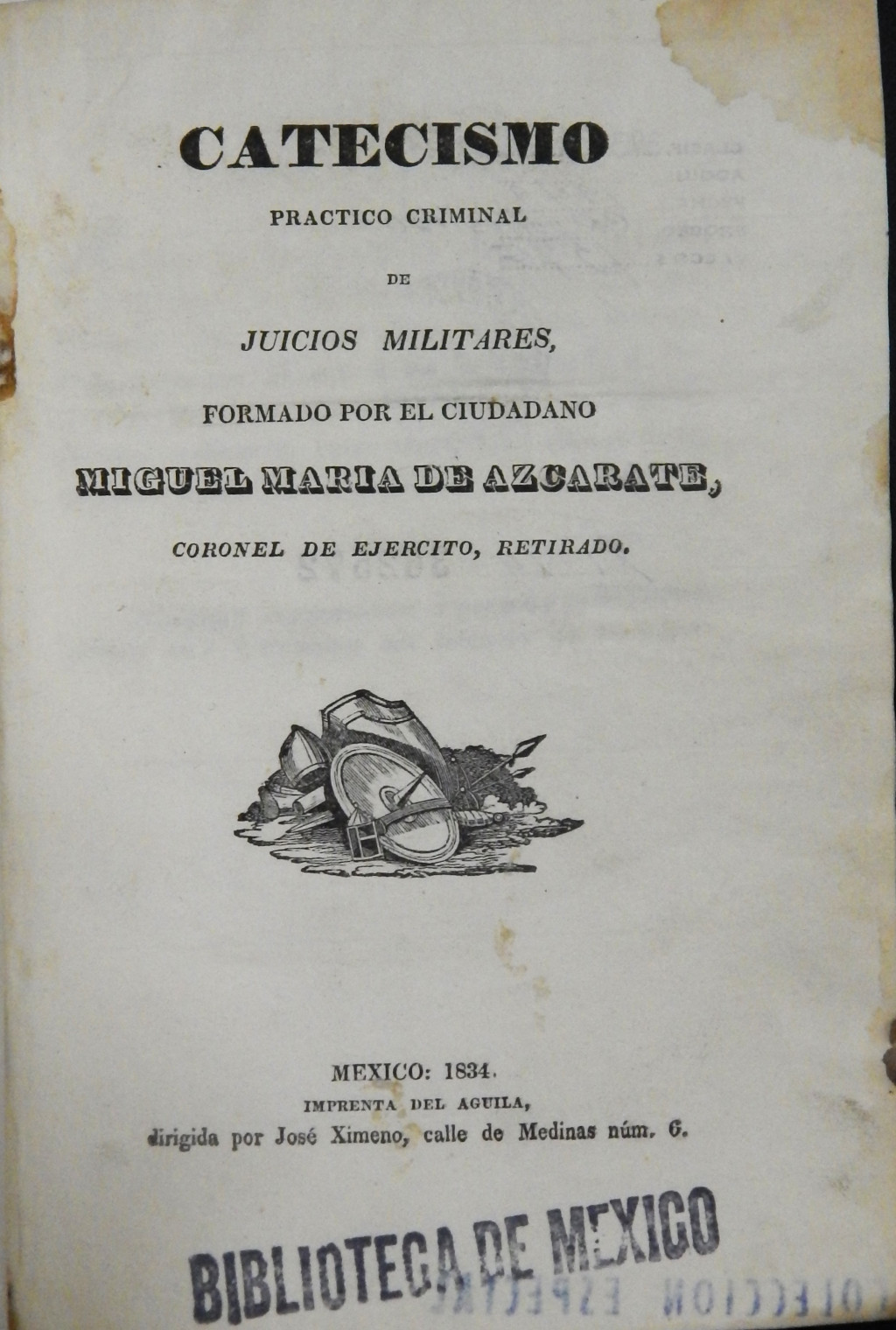 Catecismo práctico criminal de juicios militares MX-SC-DGB-BM-RV-22570 Descargar Adjuntos MX-SC-DGB-BM-RV-22570 Registro catalográfico PDF disponiblesíVer PDFOrden26034No. de registro22570Clave de obraMX-SC-DGB-BM-RV-22570No. de clasificación343.720143No. de autorA99Autor personalAzcárate, Miguel María de, 1803-1877TítuloCatecismo práctico criminal de juicios militaresMención de autoríaMiguel María de AzcárateCiudad, paísMéxicoLugar asociadoMéxicoEditorialImprenta del ÁguilaAño de publicación1834Siglo de publicaciónSiglo XIXDescripción física231 p.Materias generalesDerecho militar -- México | Juicios (delitos militares) -- MéxicoColecciónColección Roberto Valles