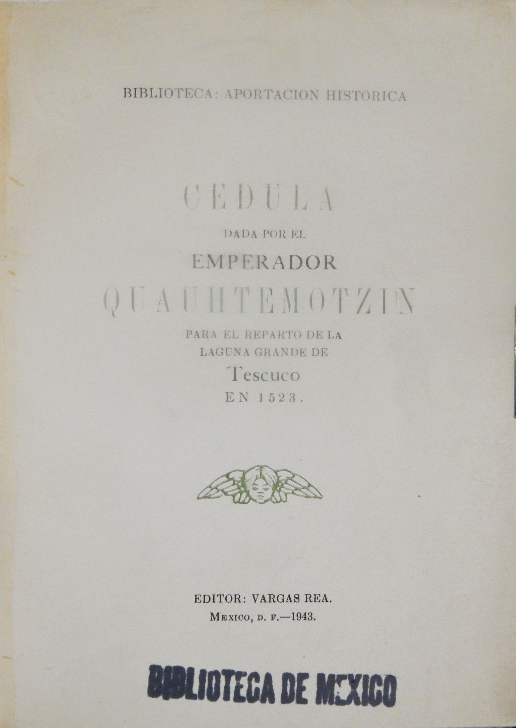 Cédula dada por el emperador Quauhtemotzin MX-SC-DGB-BM-RV-22818 Descargar Registro catalográfico Orden26357No. de registro22818Clave de obraMX-SC-DGB-BM-RV-22818No. de clasificación972.02No. de autorC8Segundo no. de autor1943Autor personalCuauhtémoc, emperador de Mexico, 1495?-1525TítuloCédula dada por el emperador QuauhtemotzinSubtítulopara el reparto de la Laguna Grande de Tescuco en 1523Ciudad, paísMéxicoLugar asociadoMéxicoEditorialVargas ReaAño de publicación1943Siglo de publicaciónSiglo XXDescripción física24 p. : fotosMaterias generalesMéxico -- Historia -- Hasta 1517 -- Fuentes | Aztecas -- Trabajos anteriores a 1800 | Texcoco -- HistoriaColecciónColección Roberto Valles
