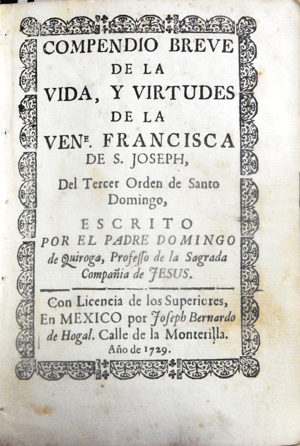 Compendio breve de la vida, y virtudes de la Vene Francisca de S. Joseph, del Tercer Orden de Santo Domingo MX-SC-DGB-BM-JGI-40054 Descargar Registro catalográfico Orden50247No. de registro40054Clave de obraMX-SC-DGB-BM-JGI-40054No. de clasificación922No. de autorF72Segundo no. de autorQ84Autor personalQuiroga, Domingo deTítuloCompendio breve de la vida, y virtudes de la Vene Francisca de S. Joseph, del Tercer Orden de Santo DomingoMención de autoríaescrito por el Padre Domingo de Quiroga ...Ciudad, paísMexicoLugar asociadoMéxicoEditorialPor Joseph Bernardo de HogalAño de publicación1729Siglo de publicaciónSiglo XVIIIDescripción física26, 339 p. : il. ; 16 cm.Materias generalesFrancisca de San José, SorColecciónColección Joaquín García Icazbalceta