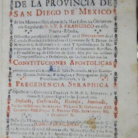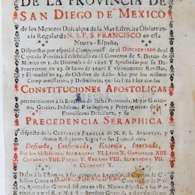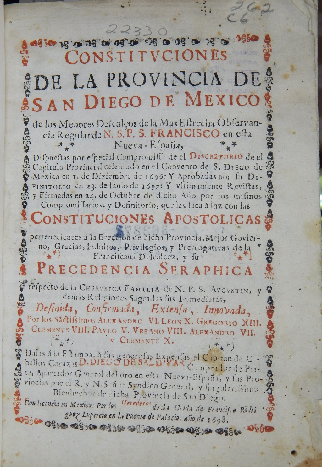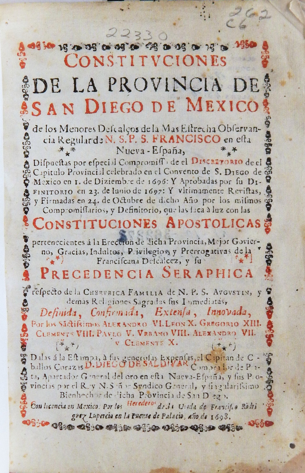 dispuestas por especial compromisso de el Discretorio de el capitulo provincial celebrado en el Convento de S. Diego de Mexico en I. de Diziembre de 1696 : y aprobadas por su Difinitorio en 23. de Iunio de 1697 : y vltimamente revistas, y firmadas en 24. de Octubre de dicho año por los mismos compromissarios, y definitorio, que las saca à luz con las constituciones Apostólicas… y su Precedencia seraphica…