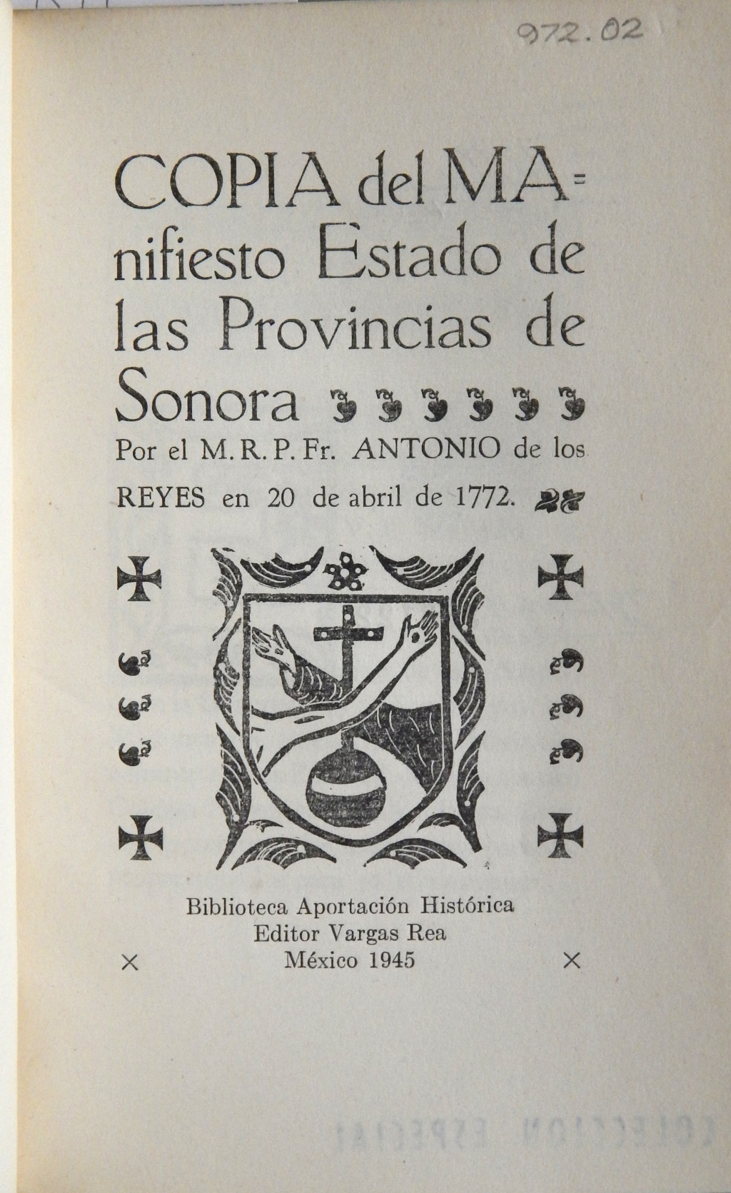 Copia del manifiesto estado de las provincias de Sonora MX-SC-DGB-BM-RV-22961 Descargar Registro catalográfico Orden26547No. de registro22961Clave de obraMX-SC-DGB-BM-RV-22961No. de clasificación271.5307215No. de autorR49Autor personalReyes, Antonio de los, 1729-1787TítuloCopia del manifiesto estado de las provincias de SonoraMención de autoríapor el M. R.P. Antonio de los Reyes en 20 de abril de 1772Ciudad, paísMéxicoLugar asociadoMéxicoEditorialVargas ReaAño de publicación1945Siglo de publicaciónSiglo XXDescripción física54 p.SerieBiblioteca Aportación HistóricaMaterias generalesJesuitas -- Misiones -- Sonora | Indios de México -- Misiones -- SonoraColecciónColección Roberto Valles Área de notas Notas generalesParticularidades: Letras capitulares. De esta edición se imprimieron 100 ejemplares numerados [no.] 65