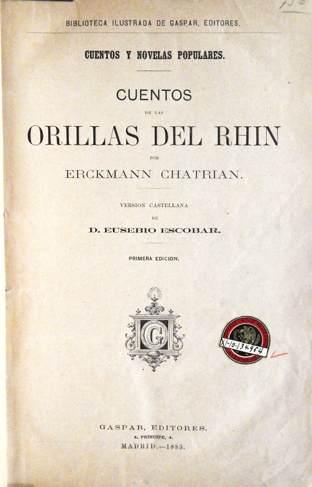 Cuentos y novelas populares MX-SC-DGB-BM-JGI-39813 Descargar Registro catalográfico Orden49813No. de registro39813Clave de obraMX-SC-DGB-BM-JGI-39813No. de clasificación843No. de autorE72Segundo no. de autorC83Autor personalErckmann, Emile, 1822-1899Autor corporativoEspana. Leyes, decretos, etc.TítuloCuentos y novelas popularesMención de autoríapor Erckmann Chatrian ; Vers. castellana de Usebio Escobar ..[et Al.]Ciudad, paísMadridLugar asociadoEspaña > MadridEditorialGasparAño de publicación1882-1885Siglo de publicaciónSiglo XIXDescripción física10 t. en 1 v. : il. ; 28 cm.Materias generalesNovela francesa | Cuentos francesesColecciónColección Joaquín García Icazbalceta