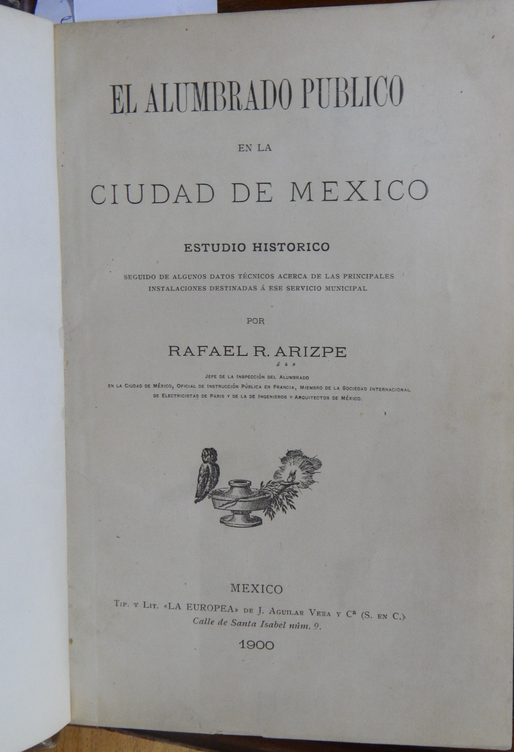 El alumbrado público en la Ciudad de México MX-SC-DGB-BM-RV-21829 Descargar Registro catalográfico Orden24968No. de registro21829Clave de obraMX-SC-DGB-BM-RV-21829No. de clasificación628.95No. de autorA73Autor personalArizpe, Rafael R.TítuloEl alumbrado público en la Ciudad de MéxicoSubtítuloestudio histórico seguido de algunos datos técnicos acerca de las principales instalaciones destinadas á ese servicio municipalMención de autoríapor Rafael R. ArizpeCiudad, paísMéxicoLugar asociadoMéxicoEditorialLa EuropeaAño de publicación1900Siglo de publicaciónSiglo XXDescripción física204 p. : mapa col. plegables, 21 láminas, fotos bynMaterias generalesAlumbrado público -- México(Ciudad) -- Historia | Servicios públicos -- Electricidad -- México (Ciudad)ColecciónColección Roberto Valles