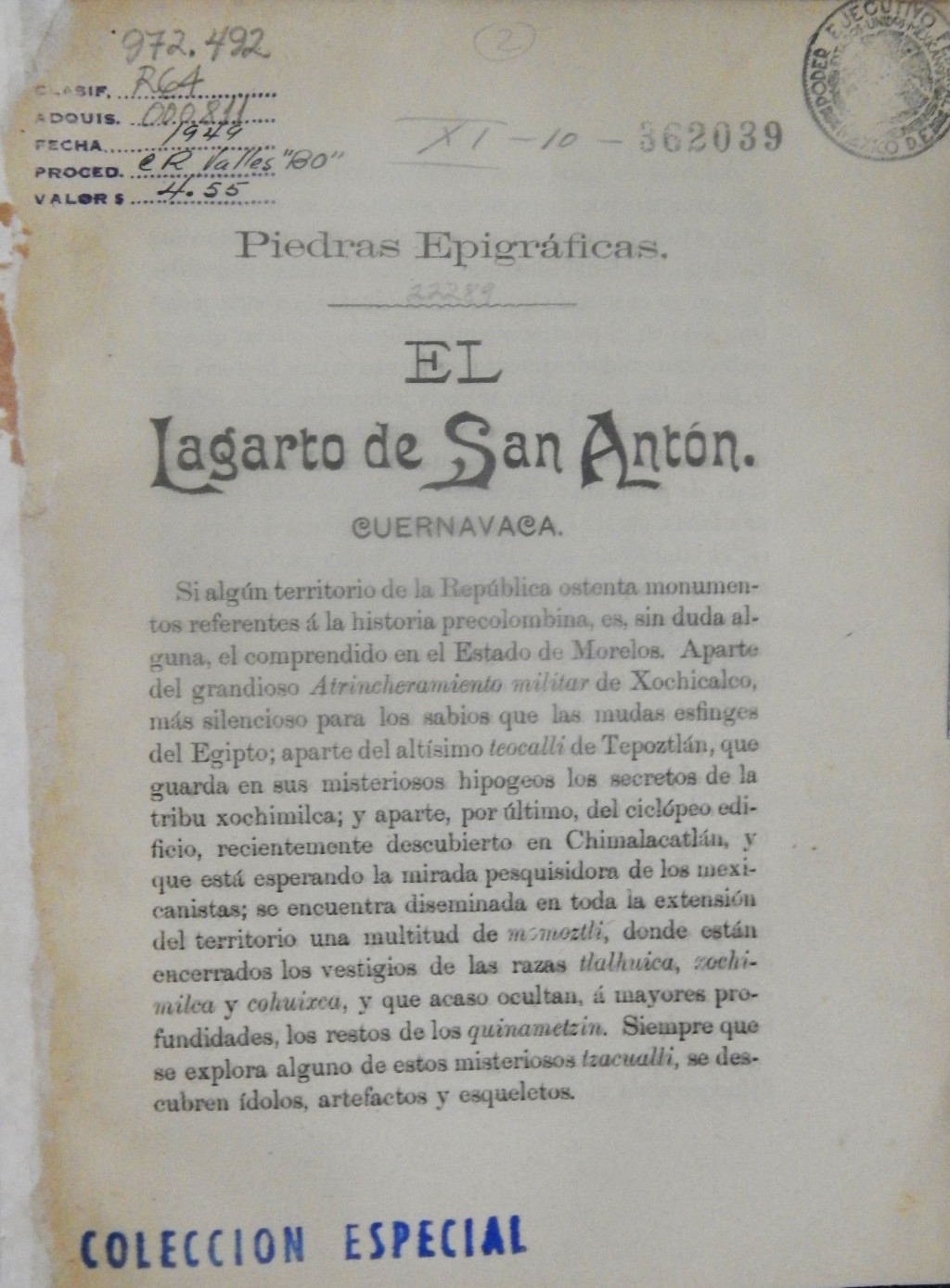 El lagarto de San Antón, Cuernavaca MX-SC-DGB-BM-RV-22289 Descargar Registro catalográfico Orden25659No. de registro22289Clave de obraMX-SC-DGB-BM-RV-22289No. de clasificación972.492No. de autorR64Autor personalRobelo, Cecilio Agustín, 1839-1916TítuloEl lagarto de San Antón, CuernavacaSubtítulopiedras epigráficasMención de autoríaCecilio A. RobeloCiudad, paísCuernavaca, MorLugar asociadoMéxico > Morelos > CuernavacaEditorial[s. n.]Año de publicación1898Siglo de publicaciónSiglo XIXDescripción física8 p. : il.Materias generalesIndios de México -- Morelos (Cuernavaca) -- Obras ilustradas | Indios de México -- Lenguas -- EscrituraColecciónColección Roberto Valles