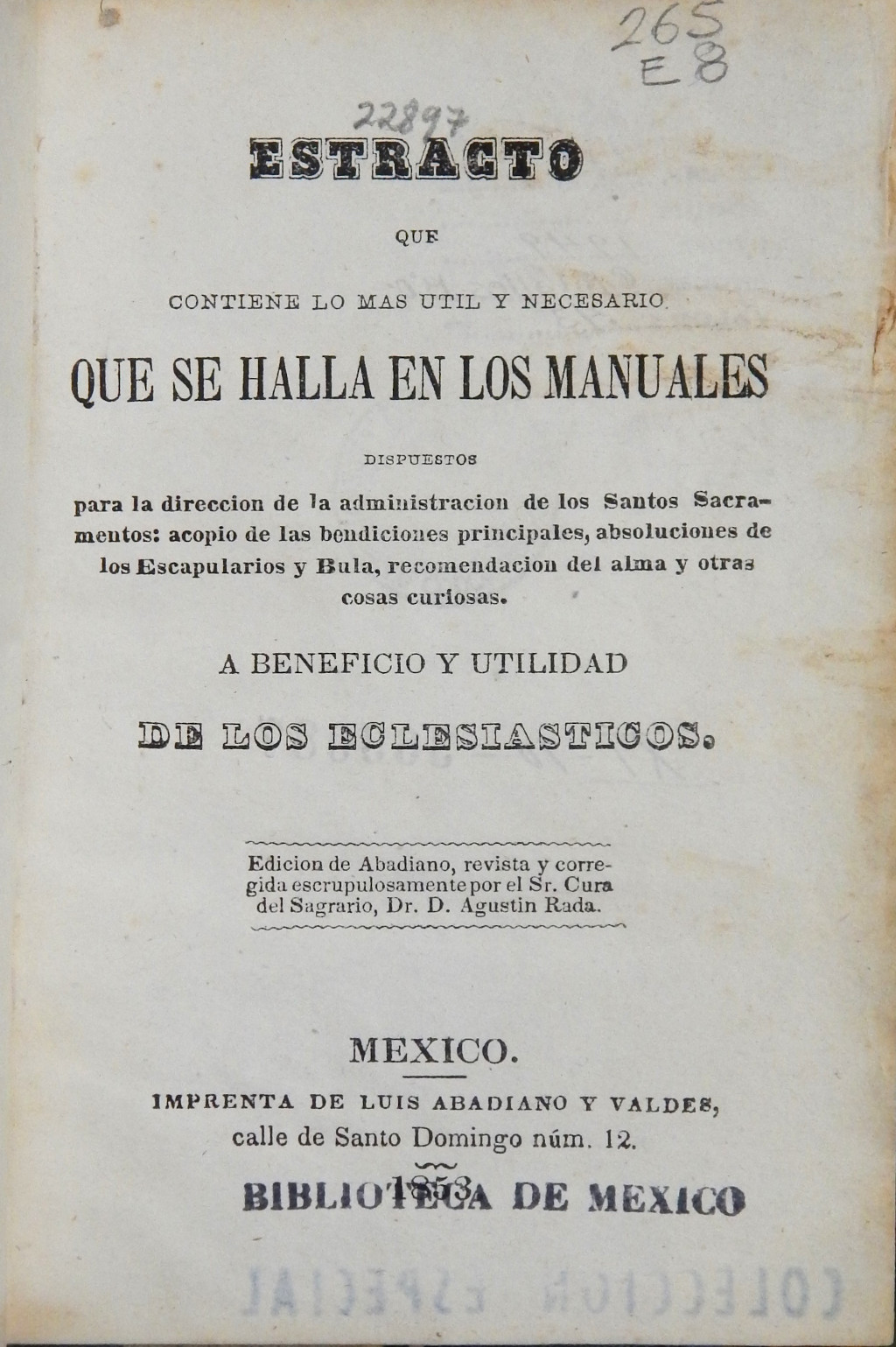 Estracto que contiene lo más útil y necesario que se halla en los manuales dispuestos para la dirección de la administración de los Santos Sacramentos