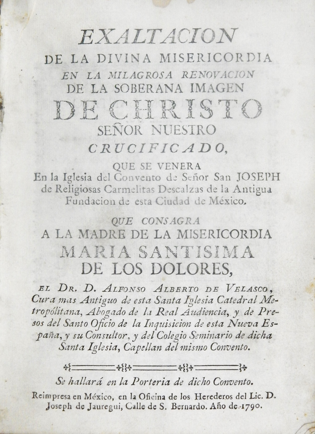 Exaltacion de la divina misericordia en la milagrosa renovacion de la soberana imagen de Christo Señor Nuestro crucificado,… MX-SC-DGB-BM-RV-22386 Descargar Registro catalográfico Orden25797No. de registro22386Clave de obraMX-SC-DGB-BM-RV-22386No. de clasificación232No. de autorV44Autor personalVelasco, Alfonso Alberto de, 1635-1704TítuloExaltacion de la divina misericordia en la milagrosa renovacion de la soberana imagen de Christo Señor Nuestro crucificado,...Mención de autoríaAlfonso Alberto de VelascoCiudad, paísMexicoLugar asociadoMéxicoEditorialOfna. de los Herederos de Joseph de JaureguiAño de publicación1790Siglo de publicaciónSiglo XVIIIDescripción física134 p. : il.Materias generalesJesucristo -- MeditacionesColecciónColección Roberto Valles