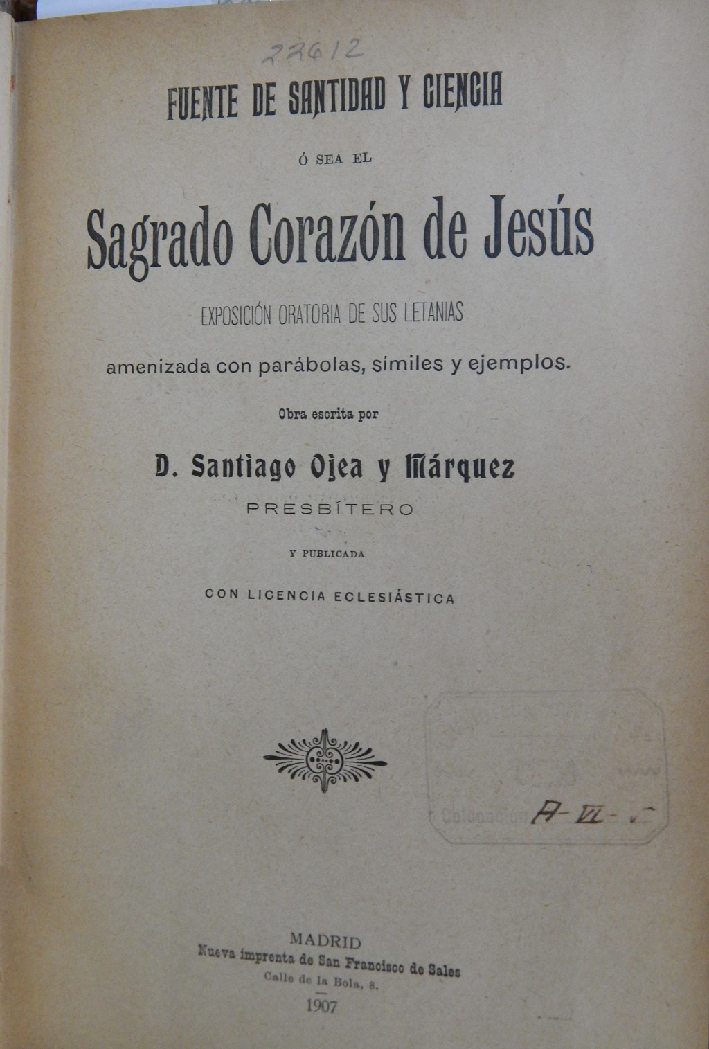 Fuente de santidad y ciencia ó sea el Sagrado Corazón de Jesús MX-SC-DGB-BM-RV-22612 Descargar Registro catalográfico Orden26087No. de registro22612Clave de obraMX-SC-DGB-BM-RV-22612No. de clasificación242.72No. de autorO43Autor personalOjea y Márquez, SantiagoTítuloFuente de santidad y ciencia ó sea el Sagrado Corazón de JesúsSubtítuloexposición oratoria de sus letanias amenizada con parábolas, símiles y ejemplosMención de autoríaobra escrita por D. Santiago Ojea y MárquezCiudad, paísMadridLugar asociadoEspaña > MadridEditorialNueva Impr. de San Francisco de SalesAño de publicación1907Siglo de publicaciónSiglo XXDescripción físicaviii, 464 p.Materias generalesSagrado Corazón de Jesús | AscetismoColecciónColección Roberto Valles Área de notas Notas generalesParticularidades: Letras capitulares. Notas a pie de página.