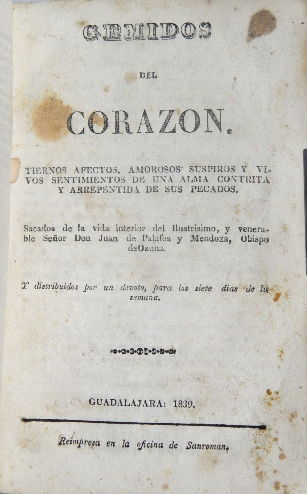 tiernos afectos, amorosos suspiros y vivos sentimientos de una alma contrita y arrepentida de sus pecados : sacados de la vida interior del Ilustrisimo y venerable Señor Don Juan de Palafos y Mendoza y distribuidos por un devoto, para los siete dias de la semana...