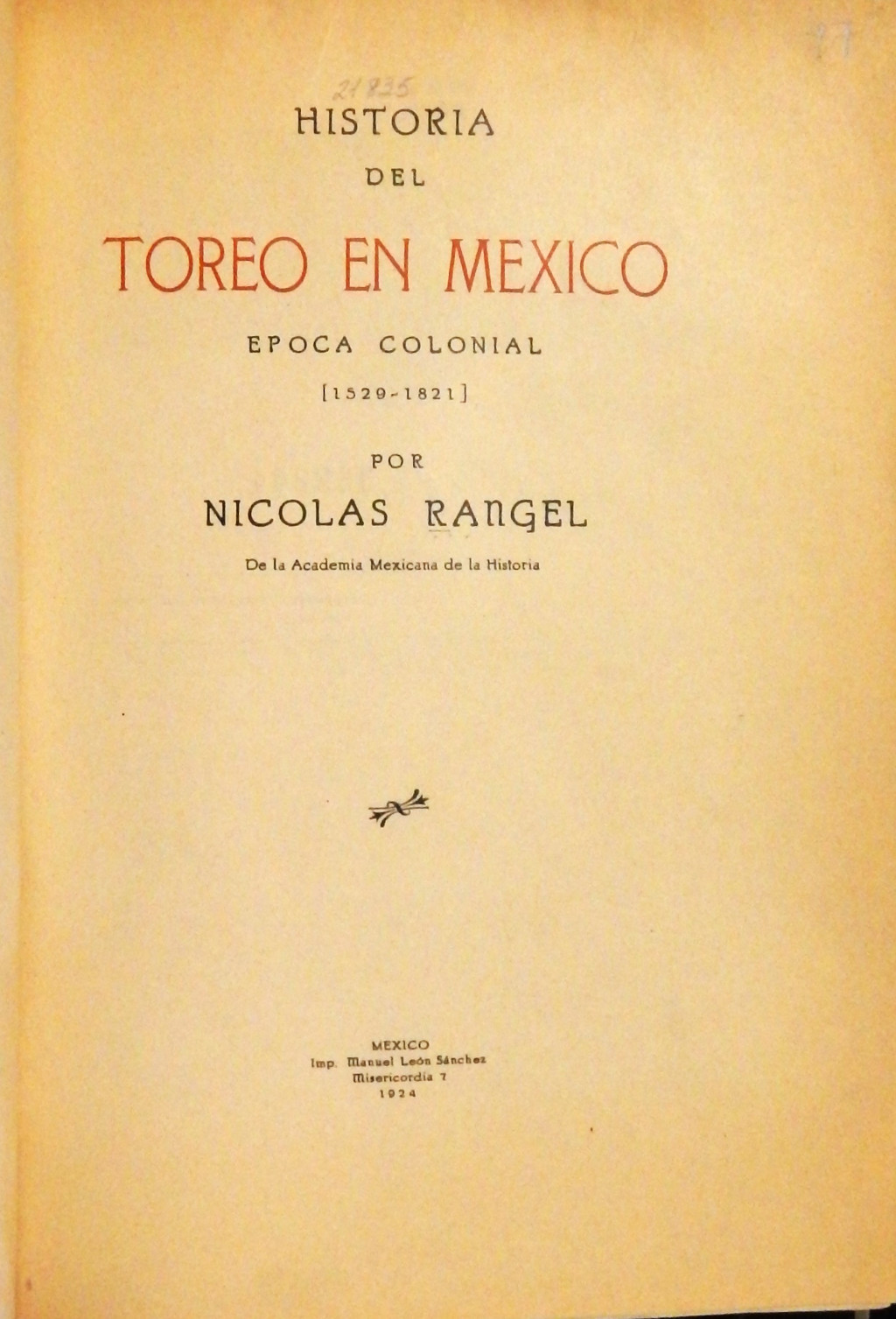 Historia del toreo en México MX-SC-DGB-BM-RV-21835 Descargar Registro catalográfico Orden24975No. de registro21835Clave de obraMX-SC-DGB-BM-RV-21835No. de clasificación791.80972No. de autorR37Autor personalRangel, Nicolás, 1864-?TítuloHistoria del toreo en MéxicoSubtítuloépoca colonial 1529-1821Mención de autoríapor Nicolás RangelCiudad, paísMéxicoLugar asociadoMéxicoEditorialImpr. Manuel León SánchezAño de publicación1924Siglo de publicaciónSiglo XXDescripción física374, [6] p. : fotos byn.Materias generalesCorrida de Toros -- México -- HistoriaColecciónColección Roberto Valles