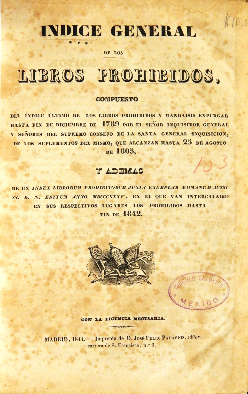 Y además de un Index librorum prohibitorum juxta exemplar romanum jussu SS. D. N. editum anno MDCCCXXXV, en el que van intercalados en sus respectivos lugares los prohibidos hasta fin de 1842