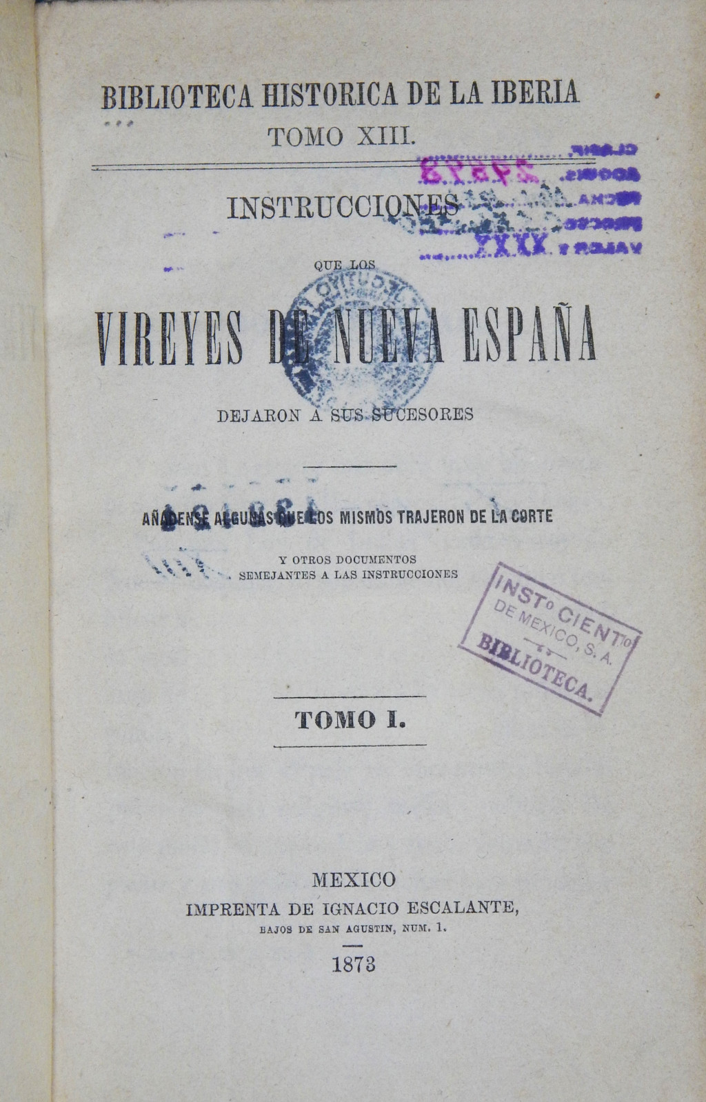 Instrucciones que los Virreyes de Nueva España dejaron a sus sucesores MX-SC-DGB-BM-JGI-39964 Descargar Registro catalográfico Orden50094No. de registro39964Clave de obraMX-SC-DGB-BM-JGI-39964No. de clasificación972.0208No. de autorI23Segundo no. de autor13-14Autor corporativoMexico (Virreinato)TítuloInstrucciones que los Virreyes de Nueva España dejaron a sus sucesoresSubtítuloañadense algunas que los mismos trajeron de la corte y otros documentos semejantes a las instruccionesCiudad, paísMexicoLugar asociadoMéxicoEditorialImpr. de Ignacio EscalanteAño de publicación1873Siglo de publicaciónSiglo XIXDescripción física2 v. : 20 cm.SerieBiblioteca Histórica de la IberiaNúmero de serieno. 13-14Materias generalesMéxico -- (Virreinato) -- Política y gobierno | México -- Historia -- Virreinato, 1535 -- 1821ColecciónColección Joaquín García Icazbalceta