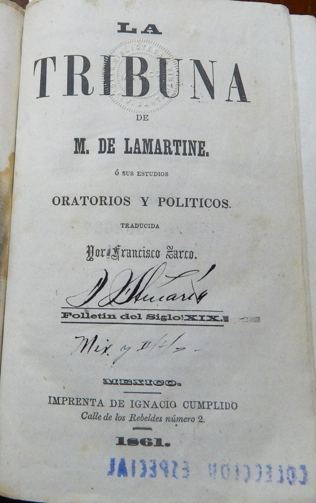 La Tribuna MX-SC-DGB-BM-RV-22601 Descargar Registro catalográfico Orden26072No. de registro22601Clave de obraMX-SC-DGB-BM-RV-22601No. de clasificación320.944No. de autorL3Autor personalLamartine, M. deTítuloLa TribunaSubtítuloo sus estudios oratorios y políticos.Mención de autoríaM. de Lamartine ; tr. por Francisco ZarcoCiudad, paísMéxicoLugar asociadoMéxicoEditorialImpr. de Ignacio CumplidoAño de publicación1861Siglo de publicaciónSiglo XIXDescripción física612 p. : retrato lit.Materias generalesFrancia -- Política y gobierno -- 1830-1846Coautor personalZarco, Francisco, tr.ColecciónColección Roberto Valles