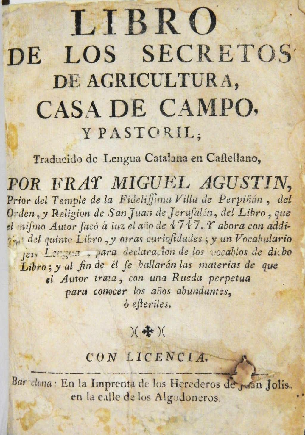 Libro de los secretos de agricultura, casa de campo y pastoril MX-SC-DGB-BM-RV-22921 Descargar Registro catalográfico Orden26495No. de registro22921Clave de obraMX-SC-DGB-BM-RV-22921No. de clasificación630No. de autorA38Autor personalAgustin, Miguel, 1560-1630TítuloLibro de los secretos de agricultura, casa de campo y pastorilMención de autoríapor Fray Miguel AgustínCiudad, paísBarcelonaLugar asociadoEspaña > BarcelonaEditorialImpr. de los Herederos de Juan SolísAño de publicación[1717]Siglo de publicaciónSiglo XVIIIDescripción física508 p.Materias generalesAgricultura -- Trabajos anteriores a 1800ColecciónColección Roberto Valles