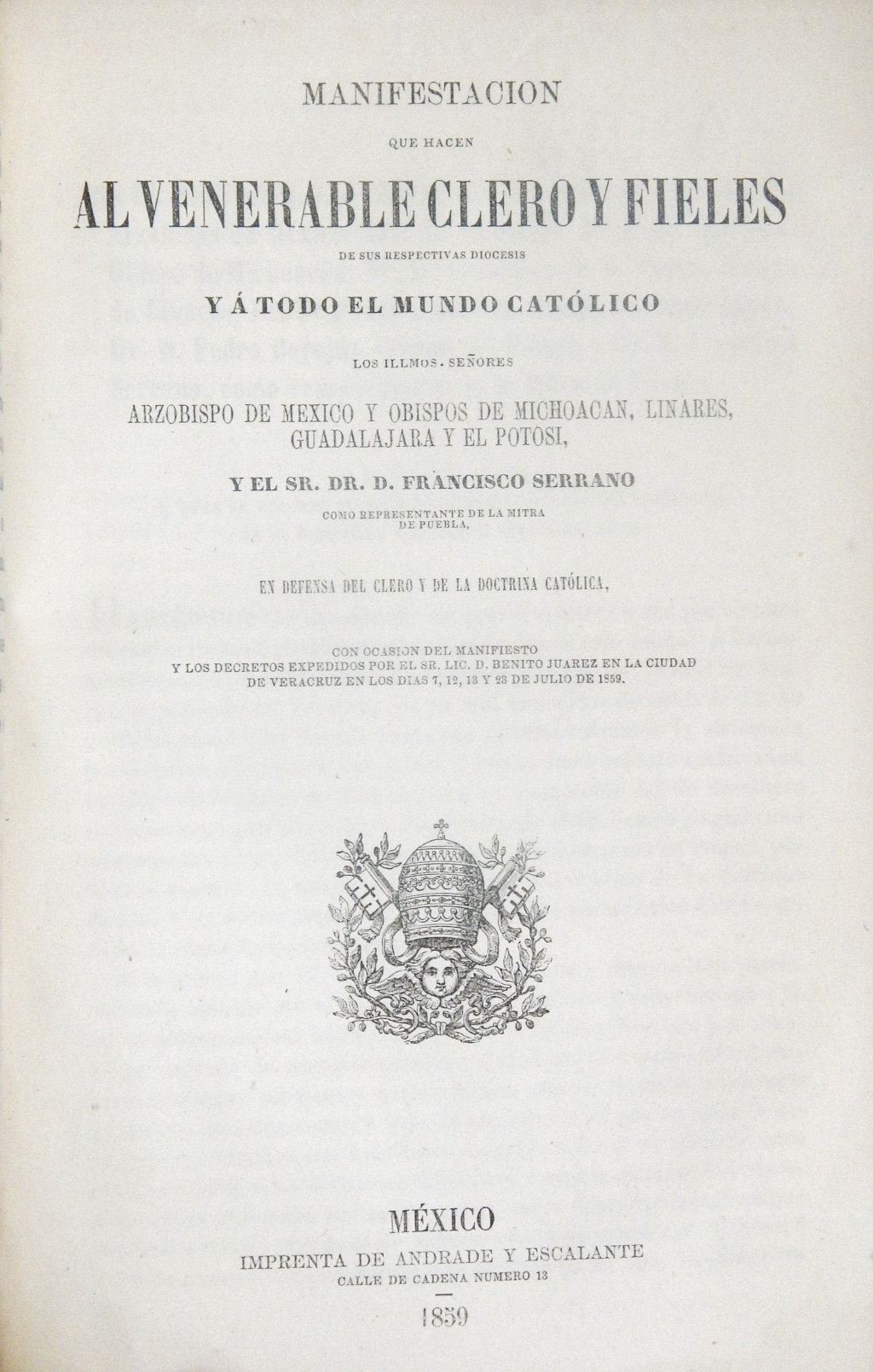 Manifestacion que hacen al venerable clero y fieles de sus respectivas Diocesis y á todo el mundo católico los Illmos. Señores Arzobispo de Mexico y Obispos de Michoacan, Linares, Guadalajara y el Potosí, y el Sr. Dr. D. Francisco Serrano, como representante de la mitra de Puebla