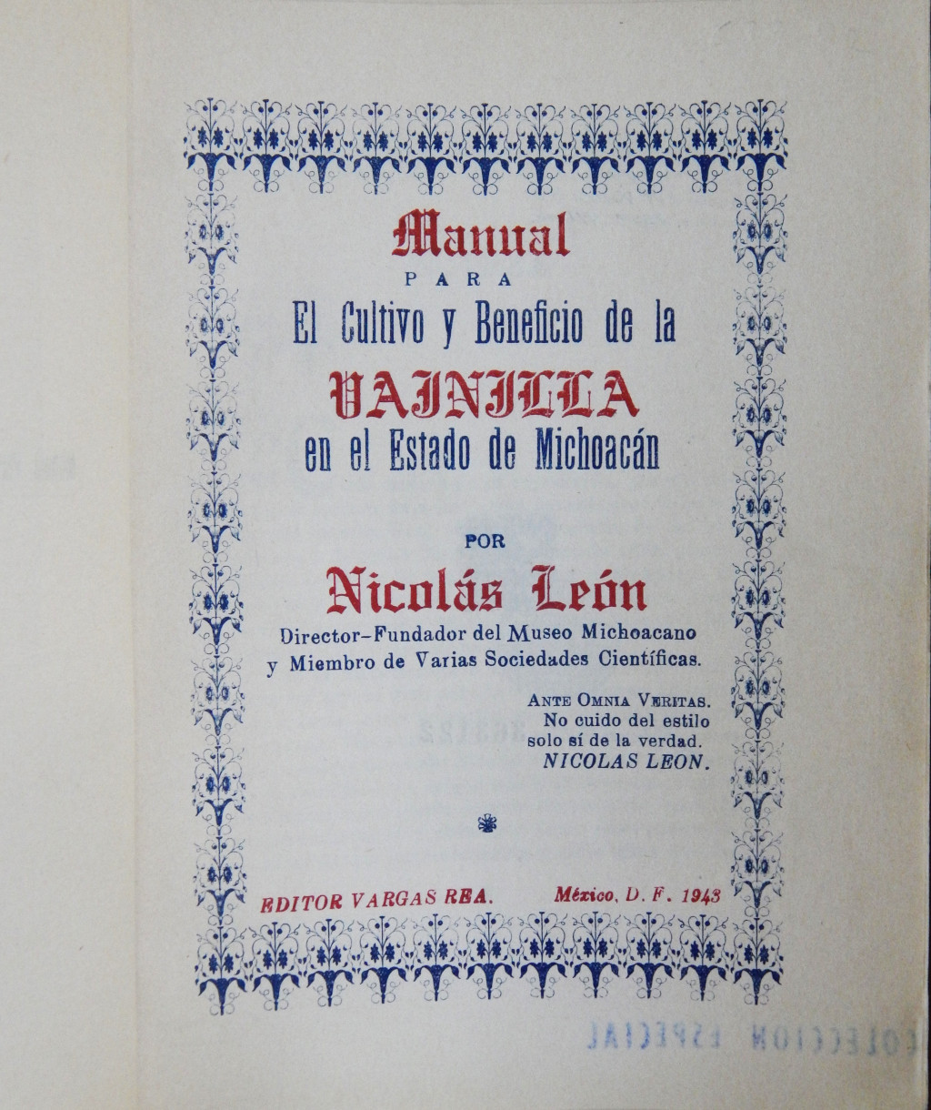 Manual para el cultivo y beneficio de la vainilla en el Estado de Michoacán MX-SC-DGB-BM-RV-22978 Descargar Registro catalográfico Orden26575No. de registro22978Clave de obraMX-SC-DGB-BM-RV-22978No. de clasificación633.82No. de autorL46Autor personalLeón, Nicolás, 1859-1929TítuloManual para el cultivo y beneficio de la vainilla en el Estado de MichoacánMención de autoríapor Nicolás LeónCiudad, paísMéxicoLugar asociadoMéxicoEditorialVargas ReaAño de publicación1943Siglo de publicaciónSiglo XXDescripción física41 p.Materias generalesVainilla -- CultivoColecciónColección Roberto Valles Área de notas Nota de contenidoLa Biblioteca posee tres ejemplares
