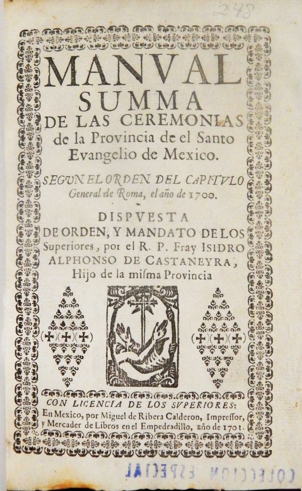 Manval summa de las ceremonias de la provincia de el Santo Evangelio de México MX-SC-DGB-BM-RV-22337 Descargar Registro catalográfico Orden25736No. de registro22337Clave de obraMX-SC-DGB-BM-RV-22337No. de clasificación282.0972No. de autorC35Autor personalCastaneyra, Isidro Alphonso deAutor corporativoMéxico (Ciudad). AyuntamientoTítuloManval summa de las ceremonias de la provincia de el Santo Evangelio de MéxicoSubtítulosegún el orden del capitvlo general de Roma, el año de 1700Mención de autoríapor el R.P. Fray Isidro Alphonso de CastaneyraCiudad, paísMexicoLugar asociadoMéxicoEditorialMiguel de Ribera CalderonAño de publicación1703Siglo de publicaciónSiglo XVIIIDescripción física80 p.Materias generalesIglesia Católica -- Liturgia | Mercedarios -- Provincia del Santo Evangelio de MéxicoColecciónColección Roberto Valles