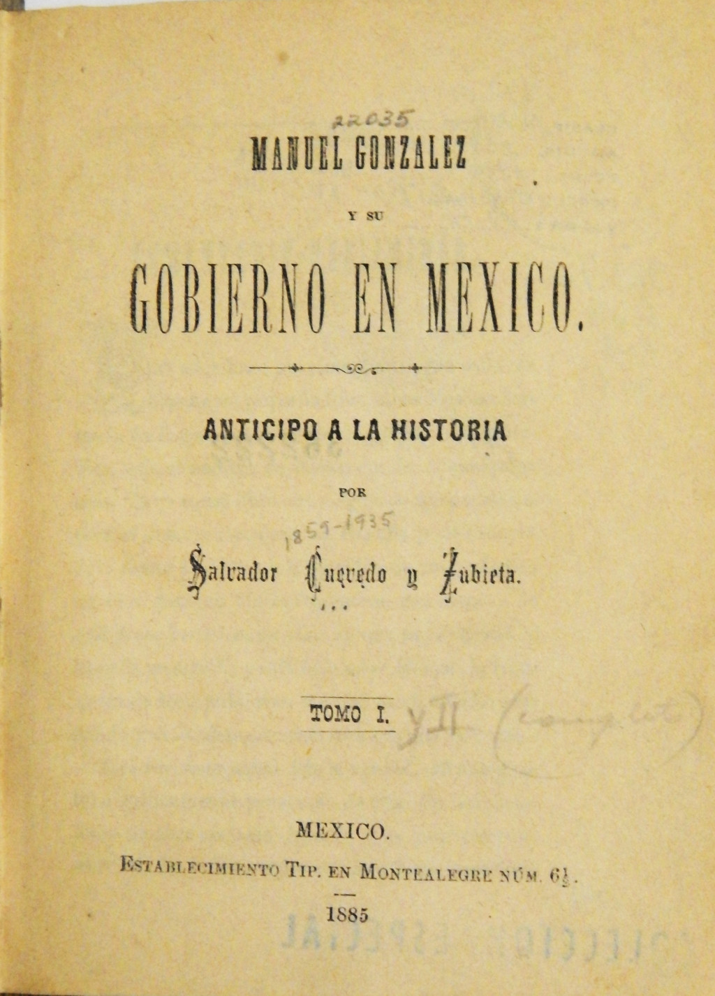 Manuel González y su gobierno en México MX-SC-DGB-BM-RV-22035 Descargar Registro catalográfico Orden25270No. de registro22035Clave de obraMX-SC-DGB-BM-RV-22035No. de clasificación923.172No. de autorG66Segundo no. de autorQ4Autor personalQuevedo y Zubieta, Salvador, 1859-1935TítuloManuel González y su gobierno en MéxicoSubtítuloanticipo a la HistoriaMención de autoríapor Salvador Quevedo y ZubietaCiudad, paísMéxicoLugar asociadoMéxicoEditorialEstablecimiento TipográficoAño de publicación1885Siglo de publicaciónSiglo XIXDescripción física294 p.Materias generalesGonzález, Manuel, presidente de México, 1883-1893 -- Biografía | Presidentes -- México -- BiografíaColecciónColección Roberto Valles