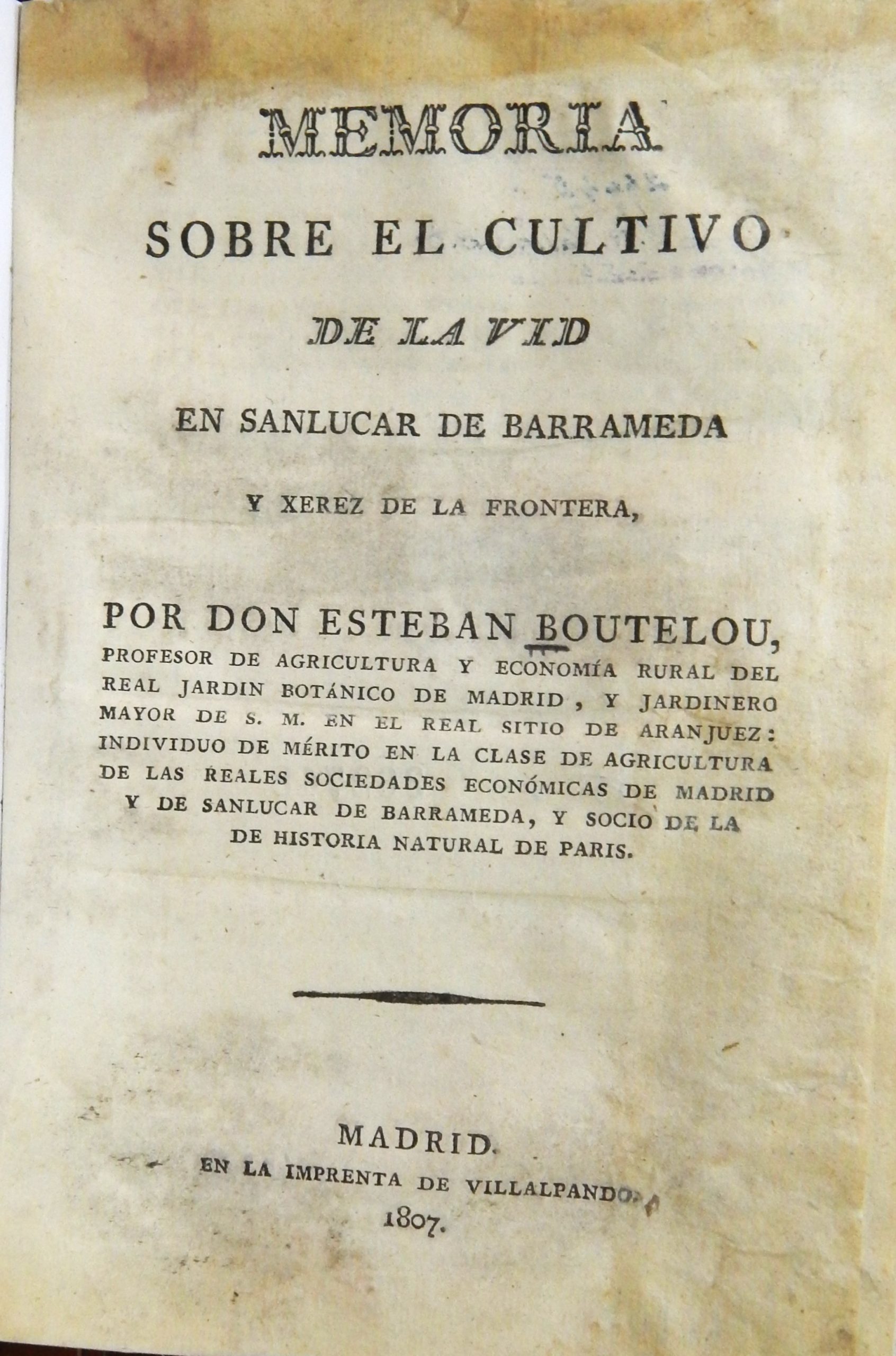 Memoria sobre el cultivo de la vid en Sanlucar de Barrameda y Xerez de la Frontera MX-SC-DGB-BM-RV-21828-3 Descargar Registro catalográfico Orden24967No. de registro21828Clave de obraMX-SC-DGB-BM-RV-21828No. de clasificación634.8No. de autorB68Autor personalBoutelou, EstebanTítuloMemoria sobre el cultivo de la vid en Sanlucar de Barrameda y Xerez de la FronteraMención de autoríapor Don Esteban BoutelouCiudad, paísMadridLugar asociadoEspaña > MadridEditorialImprenta de VillalpandoAño de publicación1807Siglo de publicaciónSiglo XIXDescripción física160 p.Materias generalesViticultura -- España -- Madrid | Uvas -- Cultivo y suelosColecciónColección Roberto Valles