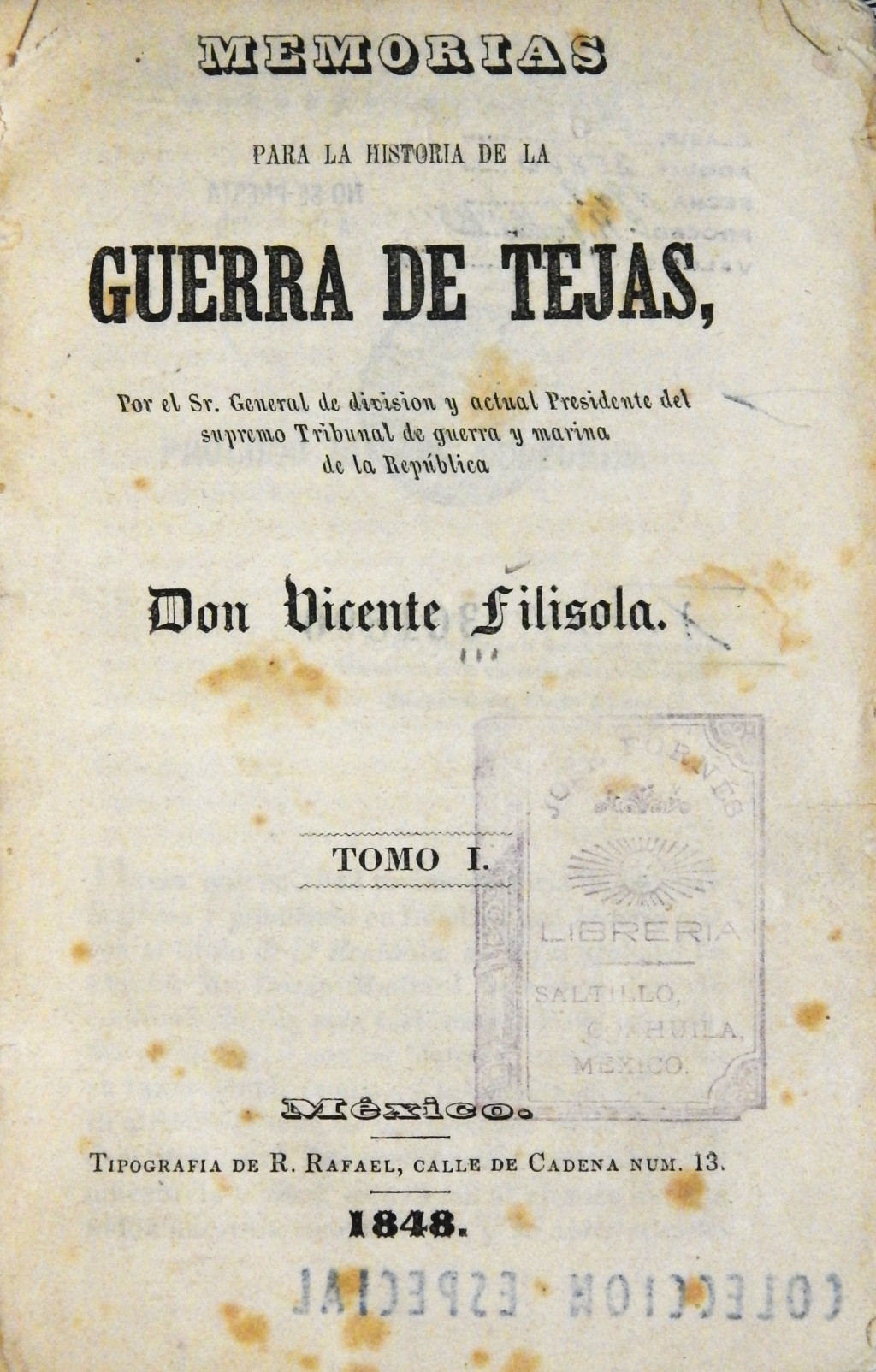 Memorias para la historia de la Guerra de Tejas MX-SC-DGB-BM-RV-22005 Descargar Registro catalográfico Orden25227No. de registro22005Clave de obraMX-SC-DGB-BM-RV-22005No. de clasificación972.0552No. de autorF34Autor personalFilisola, Vicente, m.1883TítuloMemorias para la historia de la Guerra de TejasMención de autoríaDon Vicente FilisolaCiudad, paísMéxicoLugar asociadoMéxicoEditorialTipografía de R. RafaelAño de publicación1848-1849Siglo de publicaciónSiglo XIXDescripción física2 t.Materias generalesTexas (Estados Unidos) -- Historia -- Hasta 1846 | Texas (Estados Unidos) -- Historia -- Revolución, 1835-1836ColecciónColección Roberto Valles