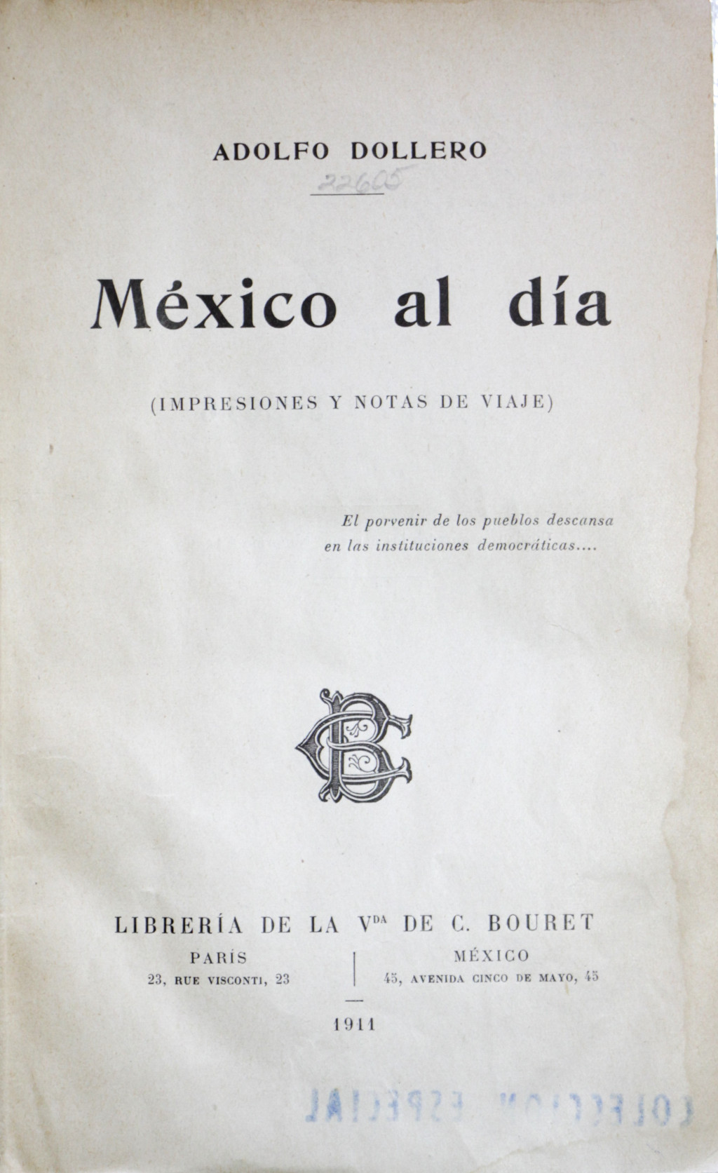 México al día MX-SC-DGB-BM-RV-22605 Descargar Registro catalográfico Orden26078No. de registro22605Clave de obraMX-SC-DGB-BM-RV-22605No. de clasificación917.2No. de autorD66Autor personalDollero, AdolfoTítuloMéxico al díaSubtítuloimpresiones y notas de viaje.Mención de autoríaAdolfo DolleroCiudad, paísParísLugar asociadoFrancia > ParísEditorialLib. de la Viuda de Ch. BouretAño de publicación1911Siglo de publicaciónSiglo XXDescripción física972 p. : fotos byn.Materias generalesMéxico -- Descripción y viajesColecciónColección Roberto Valles