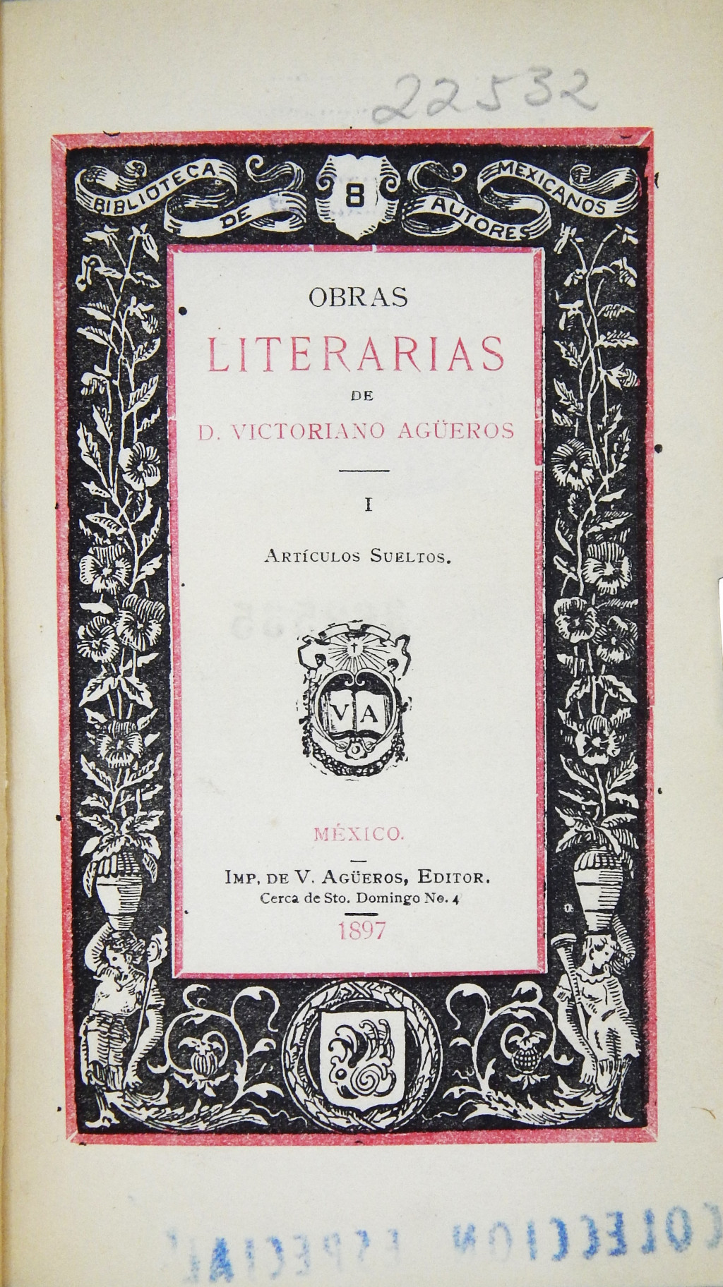 Obras literarias de Victoriano Agüeros MX-SC-DGB-BM-RV-22532 Descargar Registro catalográfico Orden25988No. de registro22532Clave de obraMX-SC-DGB-BM-RV-22532No. de clasificación868MNo. de autorA38Segundo no. de autorO2Autor personalAgüeros, Victoriano, 1854-1911TítuloObras literarias de Victoriano AgüerosCiudad, paísMéxicoLugar asociadoMéxicoEditorialImpr. de V. AgüerosAño de publicación1897Siglo de publicaciónSiglo XIXDescripción físicav. : il.SerieBiblioteca de Autores MexicanosNúmero de serie8Materias generalesLiteratura mexicana | Prosa mexicanaColecciónColección Roberto Valles Área de notas Notas generalesLa Biblioteca tiene otros 2 ejemplares. Particularidades: Portada a dos tintas y orladaNota de contenidov. 1 Artículos sueltos