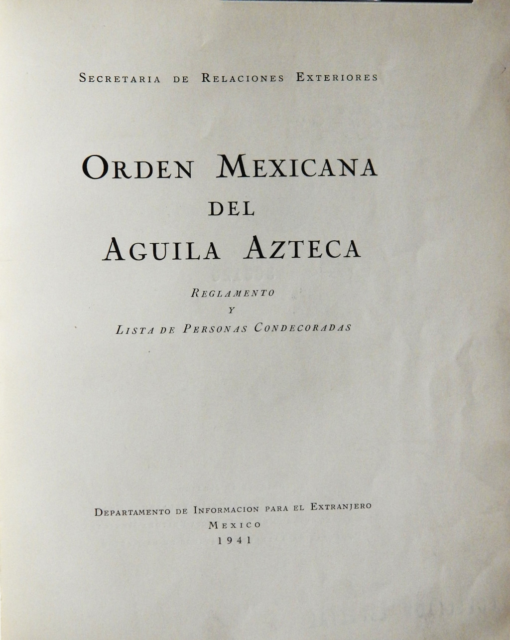 Orden Mexicana del águila azteca MX-SC-DGB-BM-RV-22953 Descargar Adjuntos Exlibris-RV-1 Registro catalográfico Orden26536No. de registro22953Clave de obraMX-SC-DGB-BM-RV-22953Autor corporativoMéxico. Secretaría de Relaciones exterioresTítuloOrden Mexicana del águila aztecaSubtítuloreglamento y lista de personas condecoradasMención de autoríaSecretaría de Relaciones exterioresCiudad, paísMéxicoLugar asociadoMéxicoEditorialSecretaría de Relaciones Exteriores. Departamento de Información para el ExtranjeroAño de publicación1941Siglo de publicaciónSiglo XXDescripción física69 p.ColecciónColección Roberto Valles