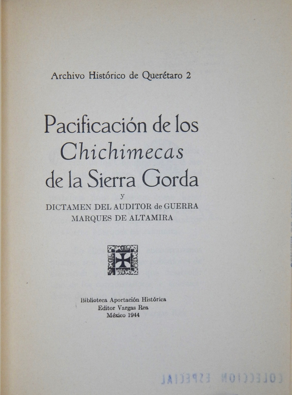 Pacificación de los Chichimecas de la Sierra Gorda y dictamen del auditor de guerra Marqués de Altamira MX-SC-DGB-BM-RV-22883 Descargar Registro catalográfico Orden26437No. de registro22883Clave de obraMX-SC-DGB-BM-RV-22883No. de clasificación972.013No. de autorA47Autor personalAltamira, Juan Rodríguez de Albuerne, Marquéz deTítuloPacificación de los Chichimecas de la Sierra Gorda y dictamen del auditor de guerra Marqués de AltamiraCiudad, paísMéxicoLugar asociadoMéxicoEditorialVargas ReaAño de publicación1944Siglo de publicaciónSiglo XXDescripción física47 p.SerieArchivo Histórico de QuerétaroNúmero de serie2Materias generalesChichimecas | Querétaro -- Historia -- FuentesColecciónColección Roberto Valles