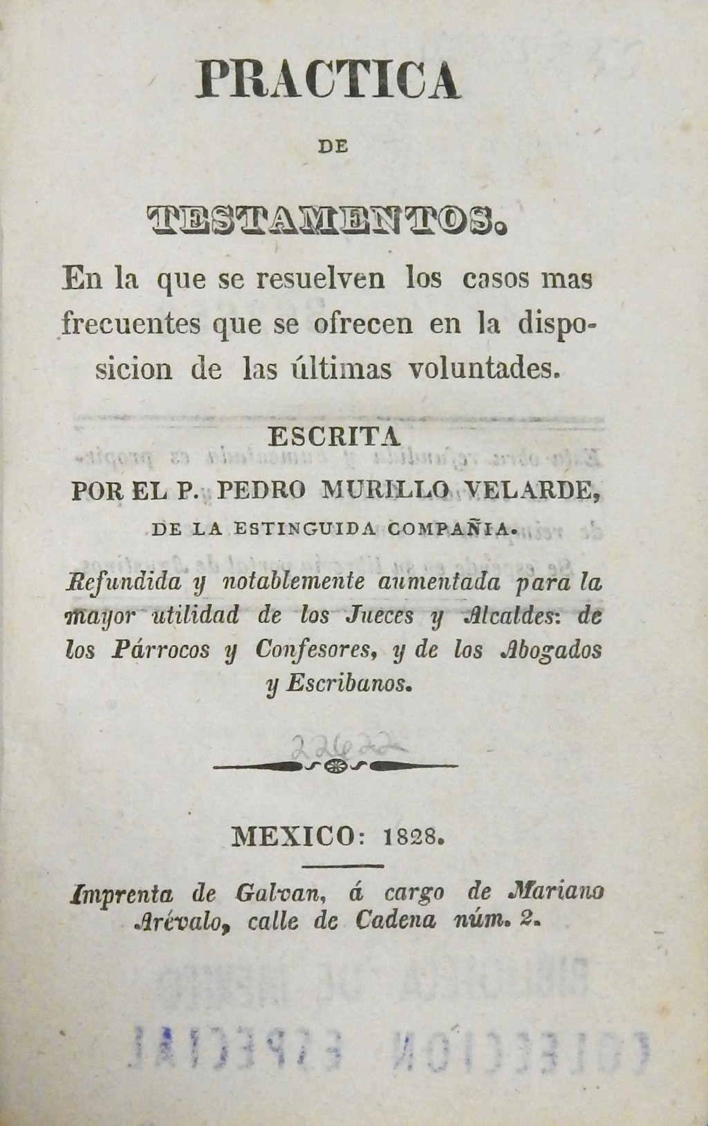 Práctica de testamentos MX-SC-DGB-BM-RV-22622 Descargar Registro catalográfico Orden26098No. de registro22622Clave de obraMX-SC-DGB-BM-RV-22622No. de clasificación346.72054No. de autorM87Autor personalMurillo Velarde, PedroTítuloPráctica de testamentosSubtítuloen la que se resuelven los casos más frecuentes que se ofrecen en la disposición de las últimas voluntades.Mención de autoríaescrita por el P. Pedro Murillo VelardeNo. ediciónRefundida y notablemente aumentadaCiudad, paísMéxicoLugar asociadoMéxicoEditorialImprenta de Galván a cargo de Mariano ArévaloAño de publicación1828Siglo de publicaciónSiglo XIXDescripción física166 p.Materias generalesTestamentos -- MéxicoColecciónColección Roberto Valles
