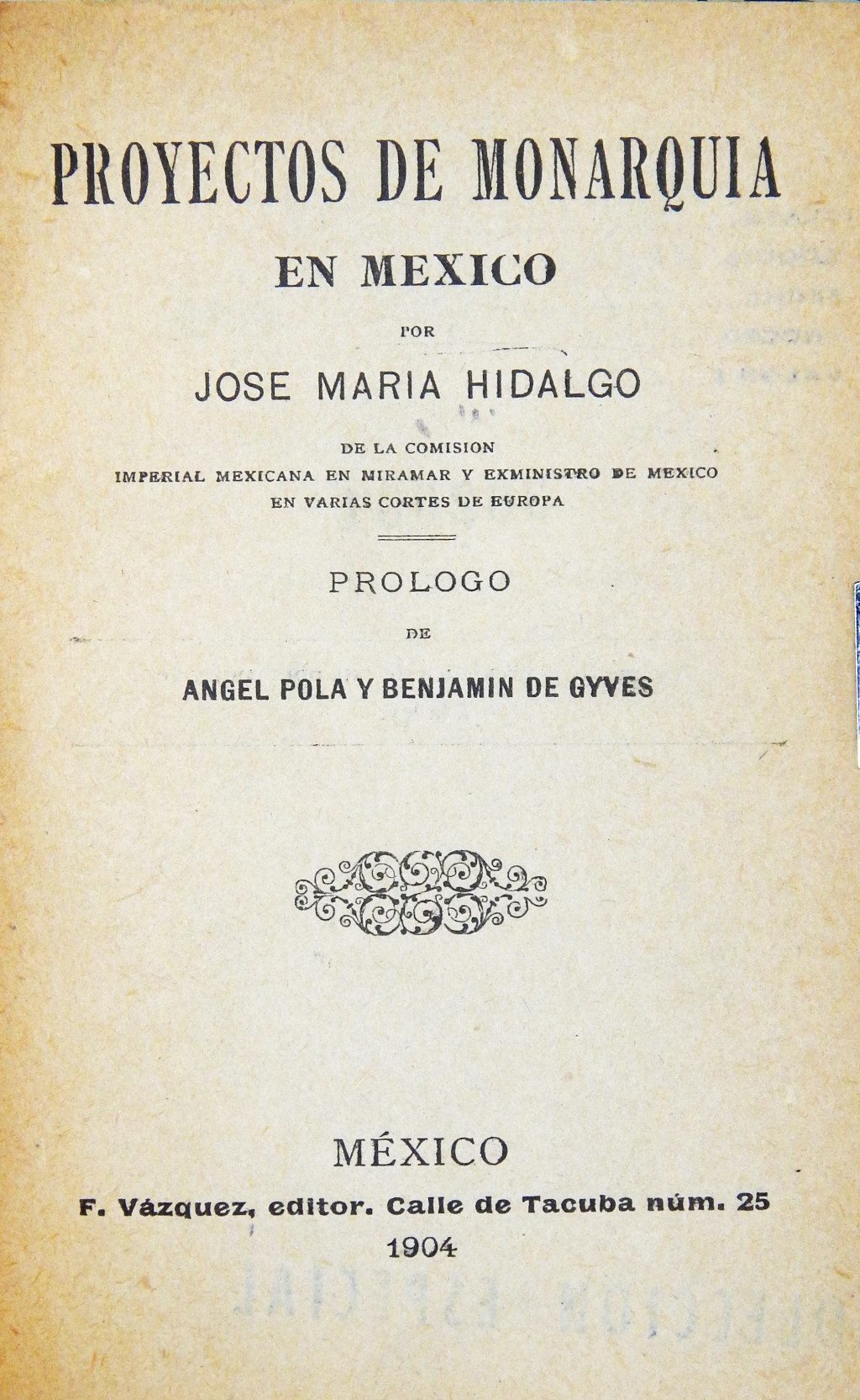 Proyectos de monarquía en México MX-SC-DGB-BM-RV-22020 Descargar Registro catalográfico Orden25250No. de registro22020Clave de obraMX-SC-DGB-BM-RV-22020No. de clasificación972.072No. de autorH56Autor personalHidalgo, José MaríaTítuloProyectos de monarquía en MéxicoCiudad, paísMéxicoLugar asociadoMéxicoEditorialF. VázquezAño de publicación1904Siglo de publicaciónSiglo XXDescripción física383, xxx, p.Materias generalesMéxico -- Historia -- 1821-1861 | México -- Historia -- Intervención y Segundo Imperio, 1861-1867Coautor personalPola, Angel, pról. | Gyves, Benjamin, pról.ColecciónColección Roberto Valles