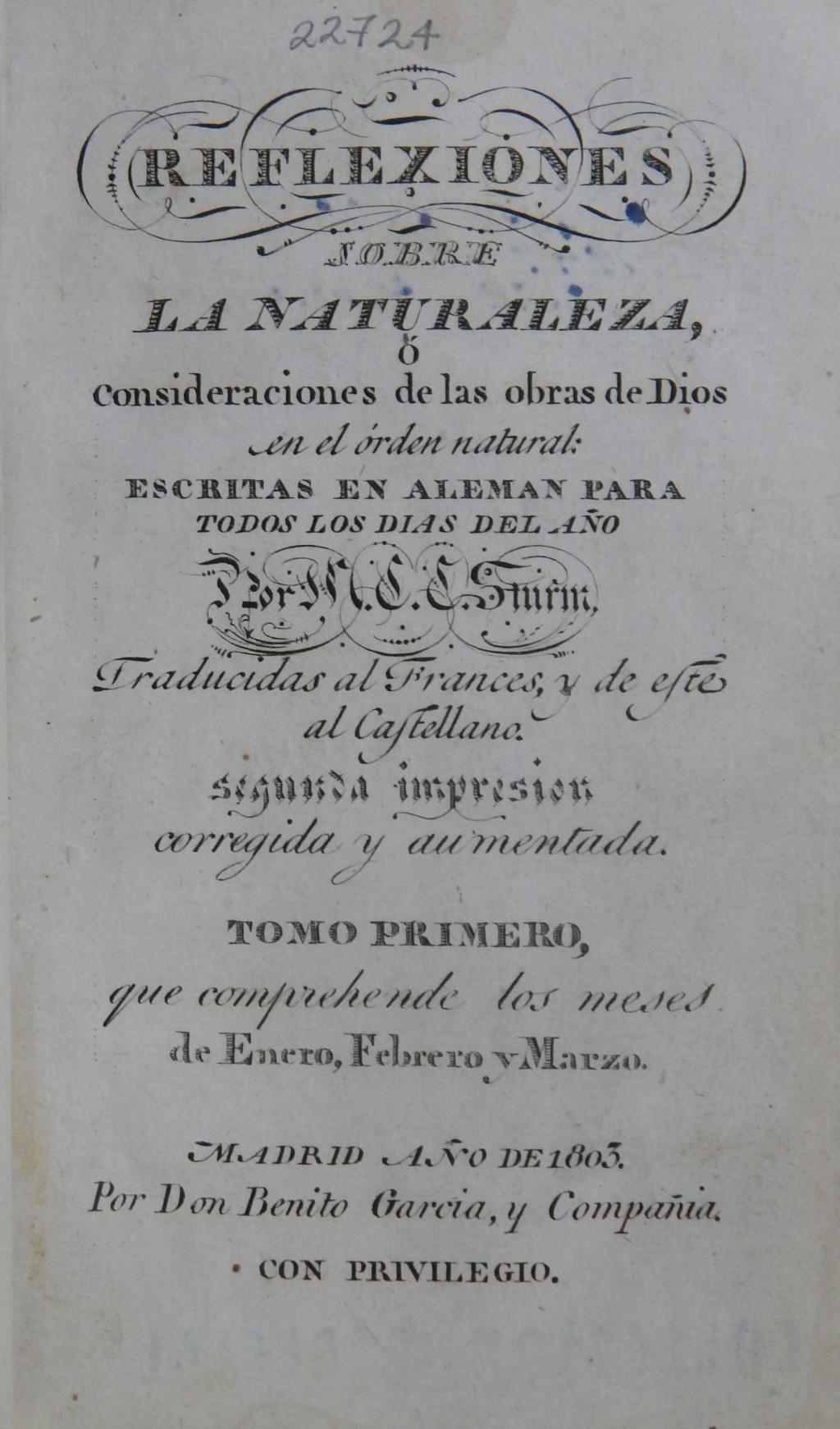 Reflexiones sobre la naturaleza, o consideraciones de las obras de Dios en el orden natural MX-SC-DGB-BM-RV-22724 Descargar Registro catalográfico Orden26237No. de registro22724Clave de obraMX-SC-DGB-BM-RV-22724No. de clasificación242.2No. de autorS72Autor personalSturm, Christoph Christian, 1740-1786TítuloReflexiones sobre la naturaleza, o consideraciones de las obras de Dios en el orden naturalSubtítuloescritas en alemán para todos los días del añoMención de autoríaC. C. SturmCiudad, paísMadridLugar asociadoEspaña > MadridEditorialBenito GarcíaAño de publicación1803Siglo de publicaciónSiglo XIXDescripción física4 v. : lit.Materias generalesIglesia Católica -- Libros de oraciones | Calendarios devotosColecciónColección Roberto Valles Área de notas Notas generalesParticularidades: Notas a pie de página. Signaturas: a-b2, A-I4, K-O4, P-Y4