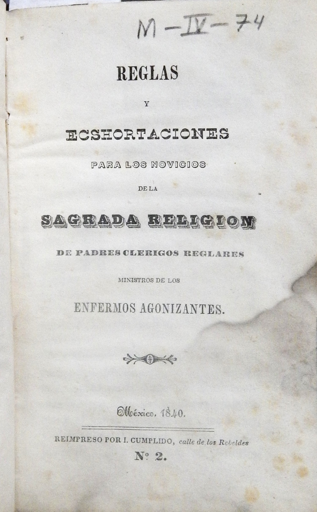 Reglas y ecshortaciones para los novicios de la Sagrada Religion de los padres clerigos reglares ministros de los enfermos agonizantes MX-SC-DGB-BM-JGI-39729 Descargar Registro catalográfico Orden49651No. de registro39729Clave de obraMX-SC-DGB-BM-JGI-39729No. de clasificación255.5No. de autorC35TítuloReglas y ecshortaciones para los novicios de la Sagrada Religion de los padres clerigos reglares ministros de los enfermos agonizantesNo. ediciónreimp.Ciudad, paísMexicoLugar asociadoMéxicoEditorialPor I. CumplidoAño de publicación1840Siglo de publicaciónSiglo XIXDescripción física81 p. ; 16 cm.Materias generalesCamilos -- ReglasColecciónColección Joaquín García Icazbalceta
