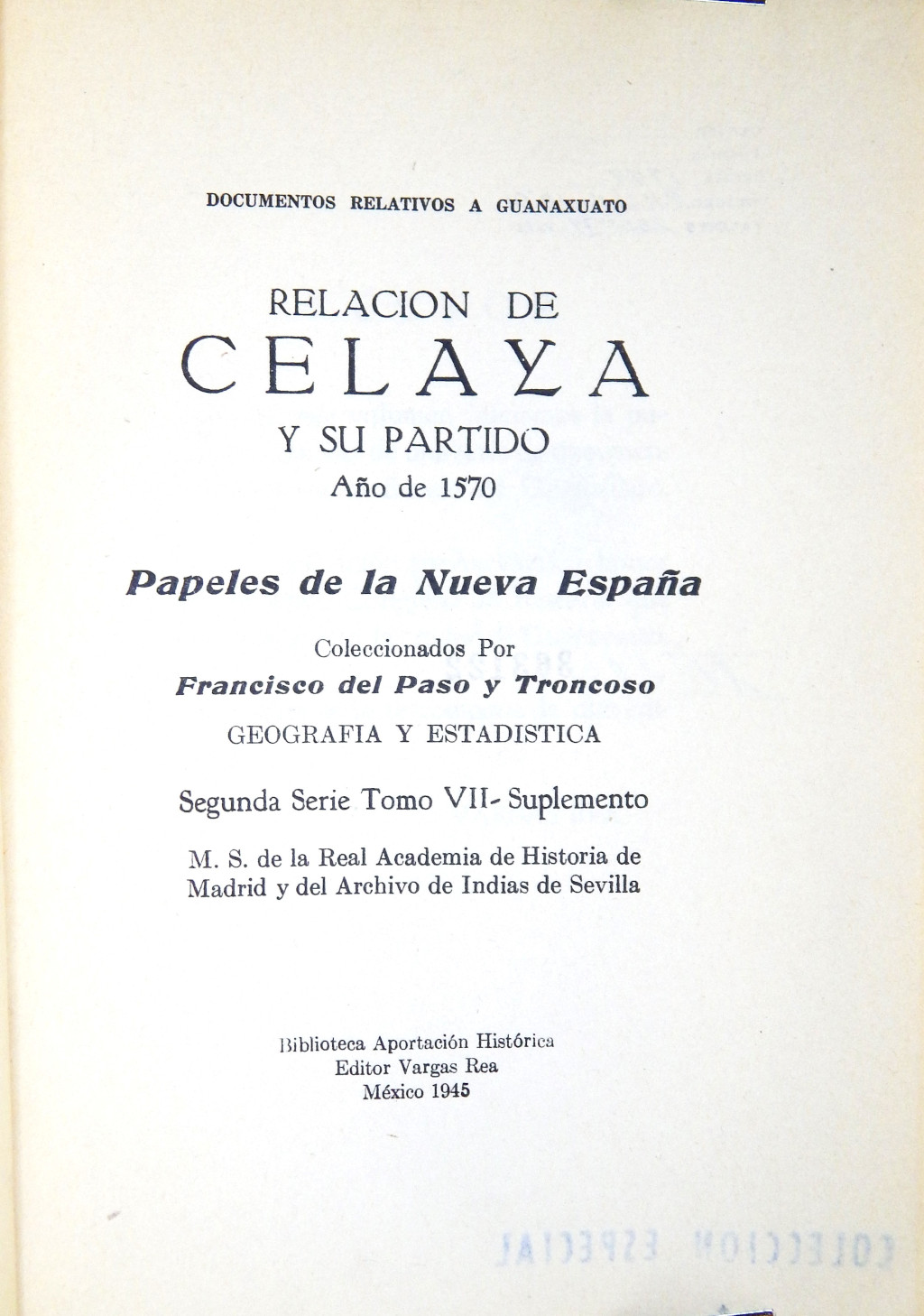 Relación de Celaya y su partido año de 1570 MX-SC-DGB-BM-RV-22866 Descargar Registro catalográfico Orden26419No. de registro22866Clave de obraMX-SC-DGB-BM-RV-22866No. de clasificación972.44No. de autorP37Autor personalPaso y Troncoso, Francisco del, 1842-1916TítuloRelación de Celaya y su partido año de 1570Mención de autoríapor Francisco del Paso y TroncosoCiudad, paísMéxicoLugar asociadoMéxicoEditorialVargas ReaAño de publicación1945Siglo de publicaciónSiglo XXDescripción físicap. 115-153 : maps.SerieBiblioteca Aportación HistóricaMaterias generalesCelaya (Guanajuato) -- Historia -- FuentesCoautor personalVargas Valades, Cristóbal deCoautor corporativoAcademia de Historia (Madrid) | Archivo General de IndiasColecciónColección Roberto Valles Área de notas Notas generalesDe esta edición se imprimieron 100 ejemplares numerados [no.] 51 Papeles de la Nueva España coleccionados por Francisco del Paso y Troncoso. Geografía y Estadística. Segunda Serie Tomo VII-Suplemento