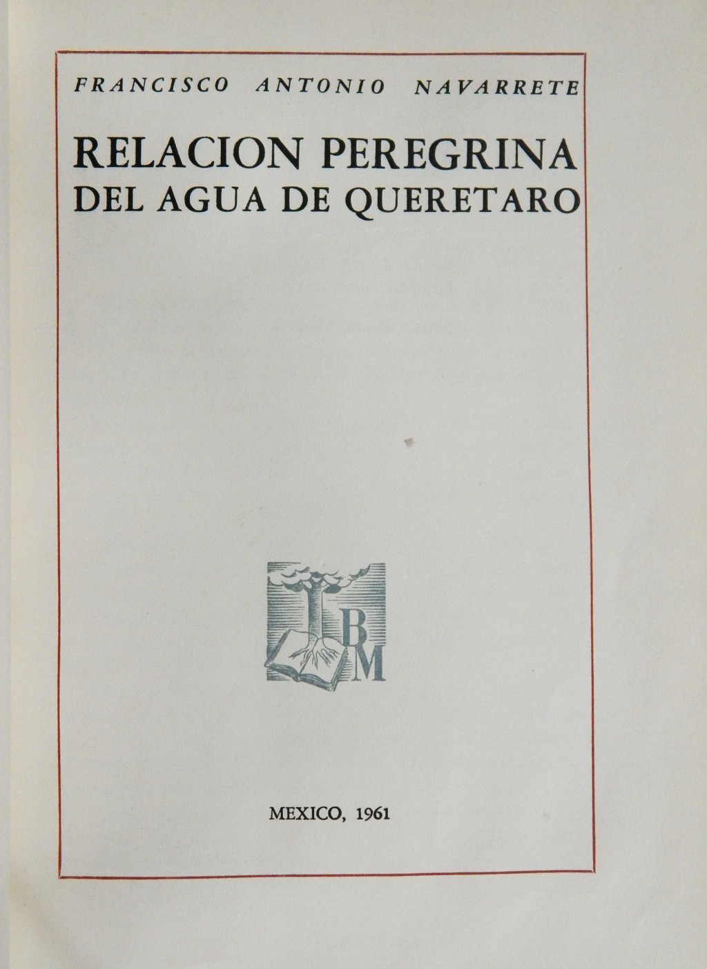 Relación peregrina del agua de Querétaro MX-SC-DGB-BM-JGI-39987 Descargar Registro catalográfico Orden50138No. de registro39987Clave de obraMX-SC-DGB-BM-JGI-39987No. de clasificación917.2452No. de autorN38Autor personalNavarrete, Francisco Antonio, 1694-1749TítuloRelación peregrina del agua de QuerétaroMención de autoríaFrancisco Antonio Navarrete ; [preambulo Francisco Monterde]Ciudad, paísMéxicoLugar asociadoMéxicoEditorialBibliófilos MexicanosAño de publicación1961Siglo de publicaciónSiglo XXDescripción física188 p. ; retrato ; 22 cm.Materias generalesQuerétaro (ciudad) -- DescripciónColecciónColección Joaquín García Icazbalceta