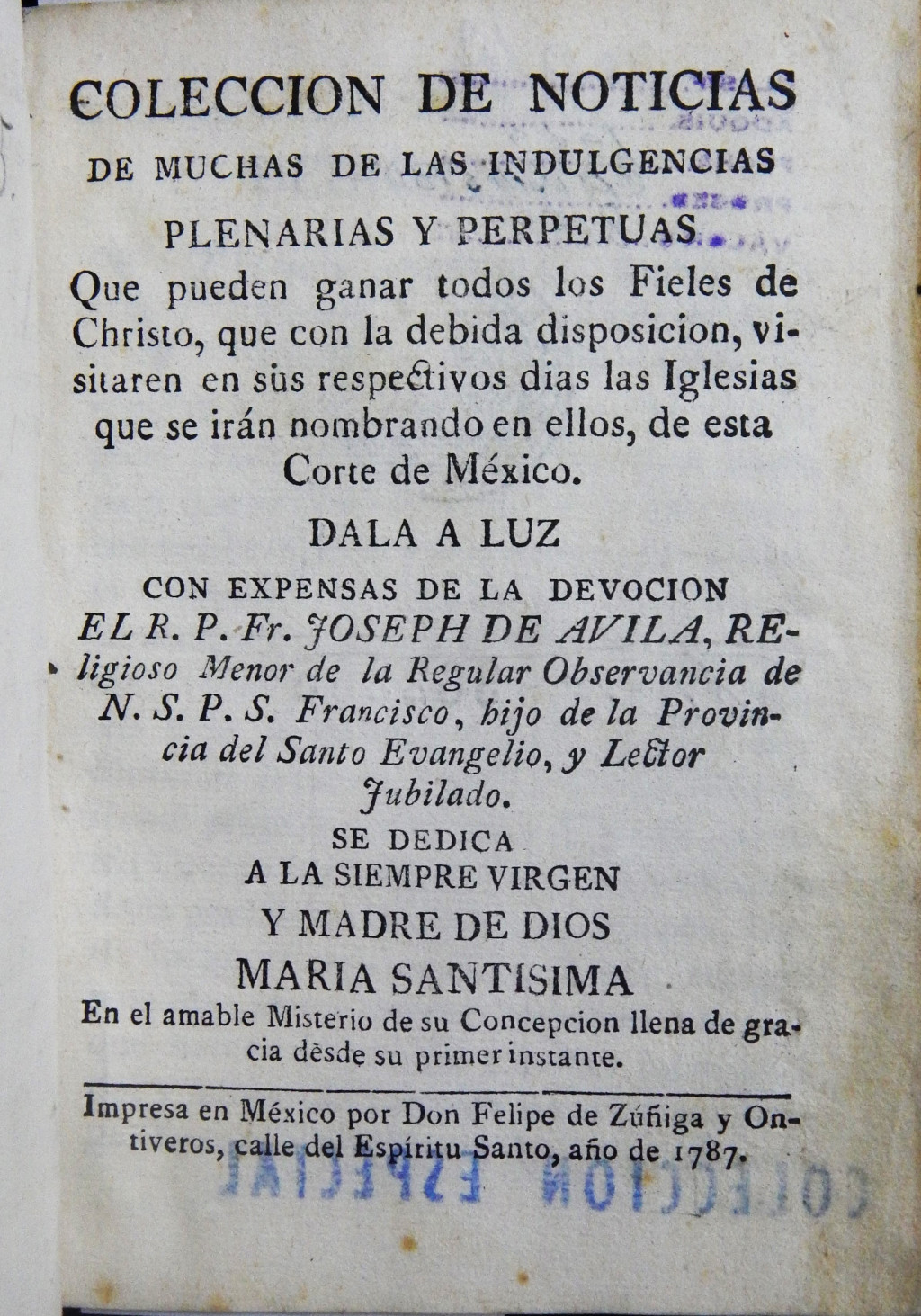 Colección de noticias de muchas de las indulgencias plenarias y perpetuas que puede ganar todos los fieles de Christo, que con la debida disposición, visitaren en sus respectivos días las Iglesias que se irán nombrando en ellos, de esta Corte de México