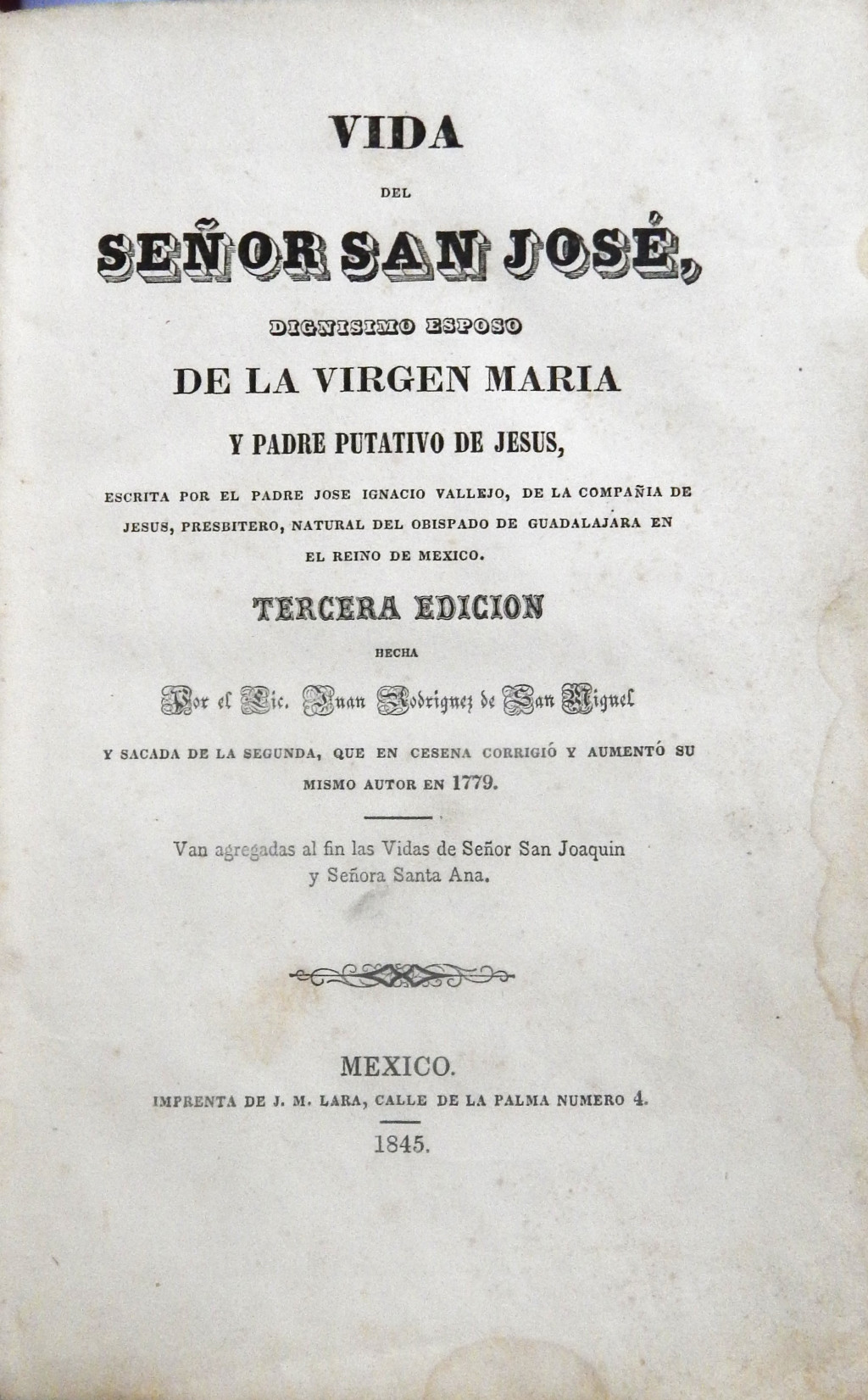 Vida del señor San José, dignisimo esposo de la Virgen María y padre putativo de Jesús MX-SC-DGB-BM-JGI-40121 Descargar Registro catalográfico PDF disponiblesíVer PDFOrden50380No. de registro40121Clave de obraMX-SC-DGB-BM-JGI-40121No. de clasificación232.932No. de autorV34Autor personalVallejo, José Ignacio, 1718-1785TítuloVida del señor San José, dignisimo esposo de la Virgen María y padre putativo de JesúsMención de autoríaescrita por José Ignacio VallejoNo. edición3a. ed./ hecha por Juan Rodríguez de San Miguel y sacada de la 2a., que se cesena corrigió y aum. su mismo autor en 1779Ciudad, paísMexicoLugar asociadoMéxicoEditorialJ. M. LaraAño de publicación1845Siglo de publicaciónSiglo XIXDescripción físicaviii, 340 p. : il. ; 23 cm.Materias generalesJosé, SanColecciónColección Joaquín García Icazbalceta