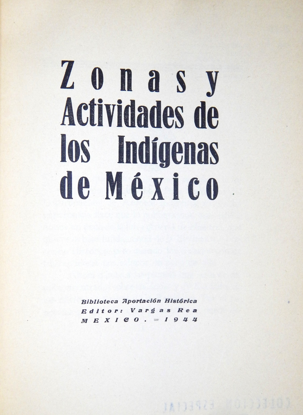 Zonas y actividades de los indígenas de México MX-SC-DGB-BM-RV-22845 Descargar Registro catalográfico Orden26393No. de registro22845Clave de obraMX-SC-DGB-BM-RV-22845No. de clasificación338.0972No. de autorZ66TítuloZonas y actividades de los indígenas de MéxicoCiudad, paísMéxicoLugar asociadoMéxicoEditorialVargas ReaAño de publicación1944Siglo de publicaciónSiglo XXDescripción física21 p.SerieBiblioteca Aportación HistóricaMaterias generalesIndios de México | Indios de México -- IndustriaCoautor corporativoMéxico. Departamento de Asuntos IndígenasColecciónColección Roberto Valles Área de notas Notas generalesParticularidades: Texto a dos columnas. De esta edición se imprimieron 100 ejemplares numerados [no.] 58Nota de contenidoLa Biblioteca posee tres ejemplares